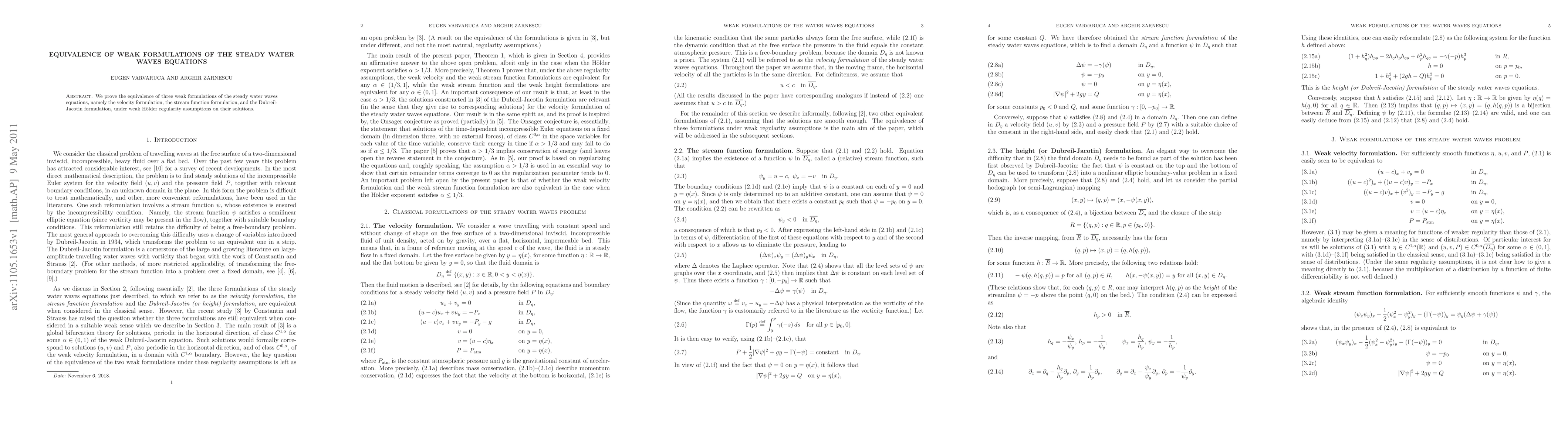 We prove the equivalence of three weak formulations of the steady water waves equations, namely the velocity formulation, the stream function formulation, and the Dubreil-Jacotin formulation, under weak Holder regularity assumptions on their solutions.