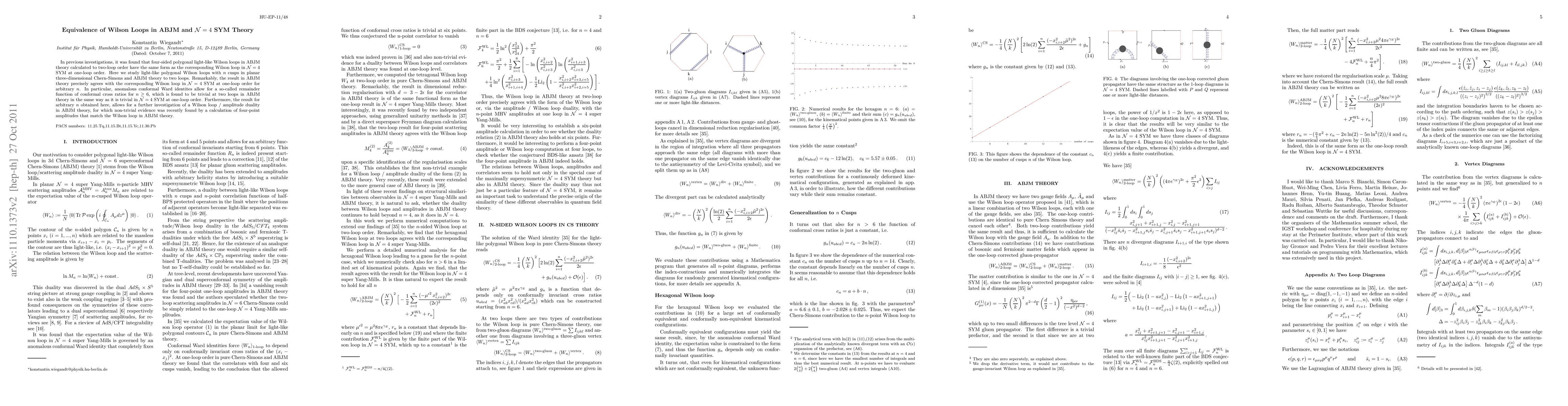 This paper demonstrates that the light-like polygonal Wilson loops in ABJM theory calculated to two-loop order precisely match those in N = 4 SYM theory at one-loop order for any number of cusps, revealing a profound equivalence between the two theories. The equivalence is further reinforced by the triviality of the conformal cross ratios' remainder function at two loops in ABJM theory, analogous to N = 4 SYM.