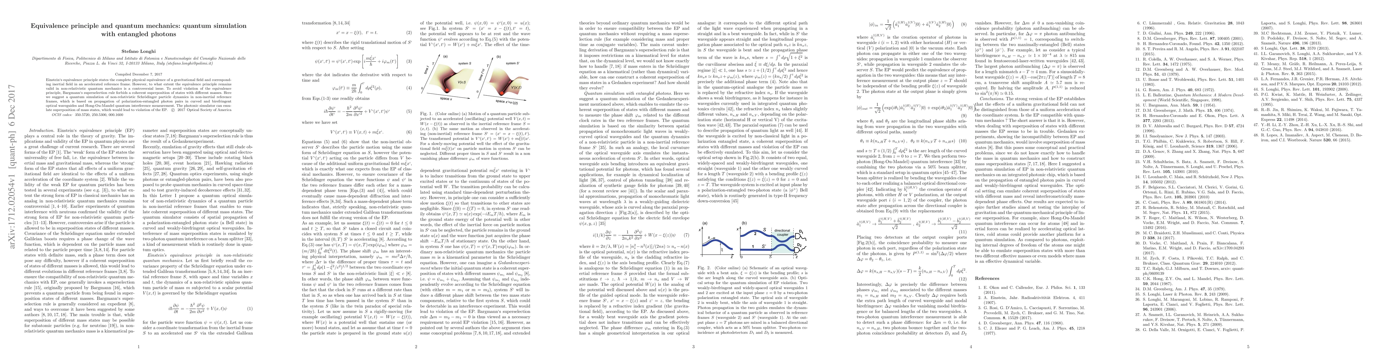 Einstein`s equivalence principle states the complete physical equivalence of a gravitational field and corresponding inertial field in an accelerated reference frame. However, to what extent the equivalence principle remains valid in non-relativistic quantum mechanics is a controversial issue. To avoid violation of the equivalence principle, Bargmann`s superselection rule forbids a coherent superposition of states with different masses. Here we suggest a quantum simulation of non-relativistic Schr\"odinger particle dynamics in non-inertial reference frames, which is based on propagation of polarization-entangled photon pairs in curved and birefringent optical waveguides and Hong-Ou-Mandel quantum interference measurement. The photonic simulator can emulate superposition of mass states, which would lead to violation of the EP.