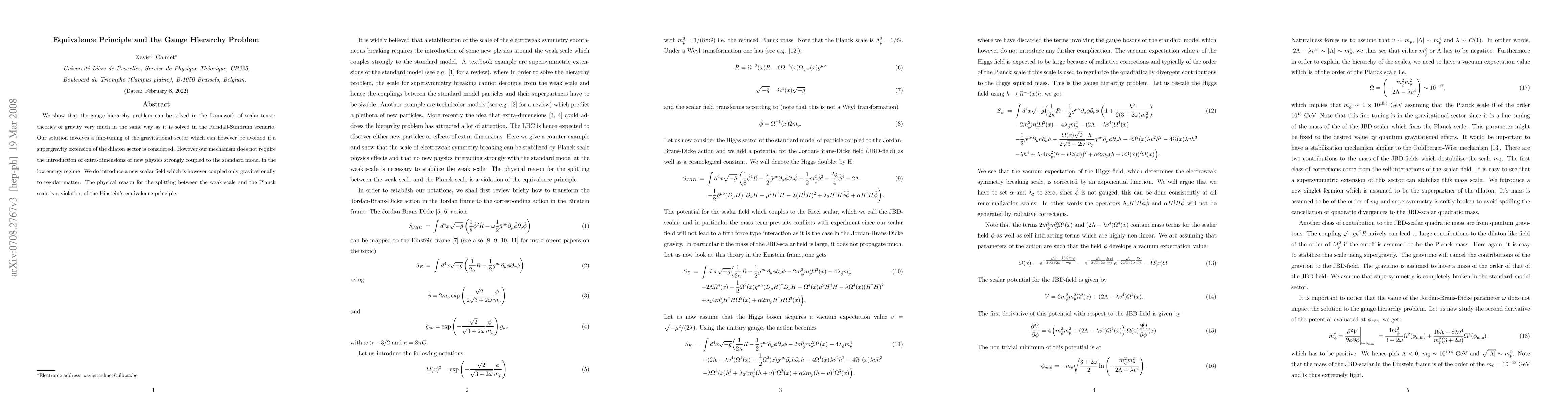 This paper proposes a solution to the gauge hierarchy problem using scalar-tensor gravity, akin to the Randall-Sundrum model but without extra dimensions. It introduces a new scalar field coupled only gravitationally, attributing the hierarchy between the weak and Planck scales to a violation of the equivalence principle.