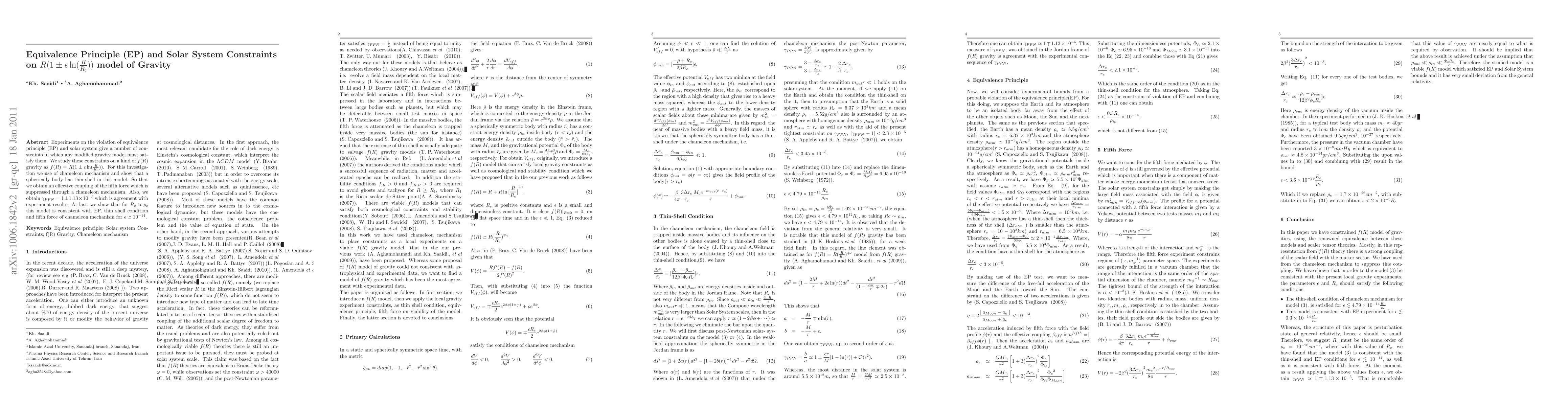 Experiments on the violation of equivalence principle (EP) and solar system give a number of constraints in which any modified gravity model must satisfy them. We study these constraints on a kind of $f(R)$ gravity as $f(R) = R(1\pm \epsilon \ln({R \over R_c}))$. For this investigation we use of chameleon mechanism and show that a spherically body has thin-shell in this model. So that we obtain an effective coupling of the fifth force which is suppressed through a chameleon mechanism. Also, we obtain $\gamma_{PPN} = 1 \pm 1.13 \times10^{-5}$ which is agreement with experiment results. At last, we show that for $R_c \thickapprox \rho_c$ this model is consistent with EP, thin shell condition and fifth force of chameleon mechanism for $\epsilon \backsimeq 10^{-14}$.