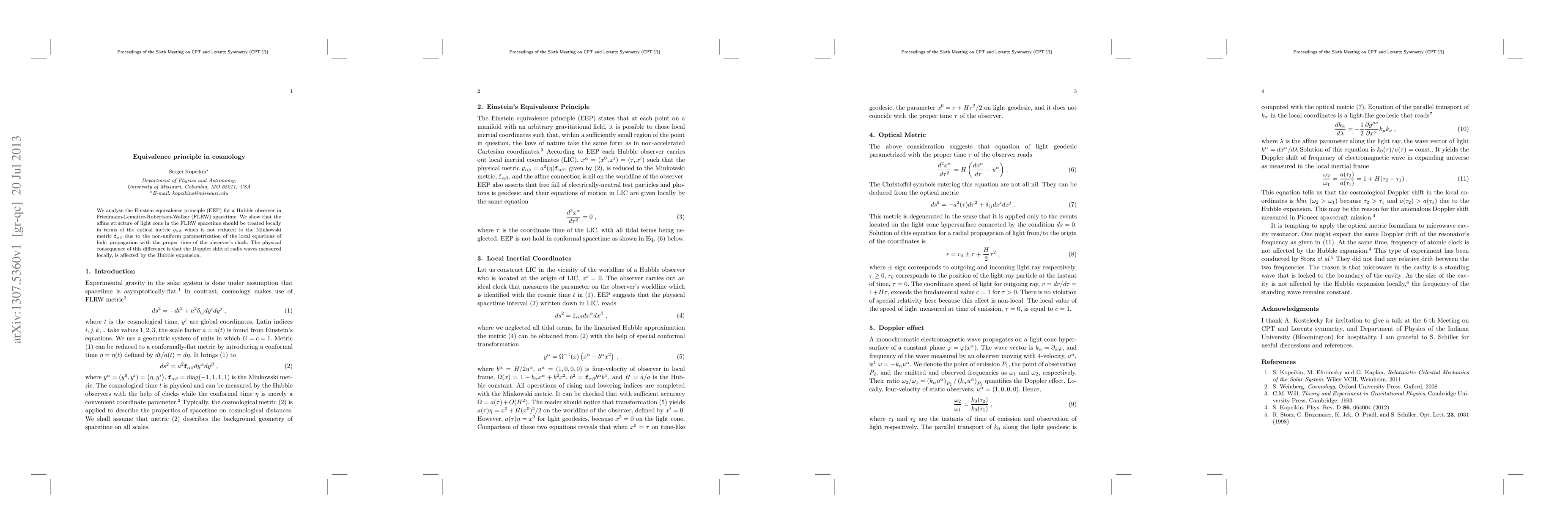 We analyse the Einstein equivalence principle (EEP) for a Hubble observer in Friedmann-Lemaitre-Robertson-Walker spacetime. We show that the affine structure of light cone in the FLRW spacetime should be treated locally in terms of the optical metric which is not reduced to the Minkowski metric due to the non-uniform parametrization of the local equations of light propagation with the proper time of the observer's clock. The physical consequence of this difference is that the Doppler shift of radio waves measured locally, is affected by the Hubble expansion.