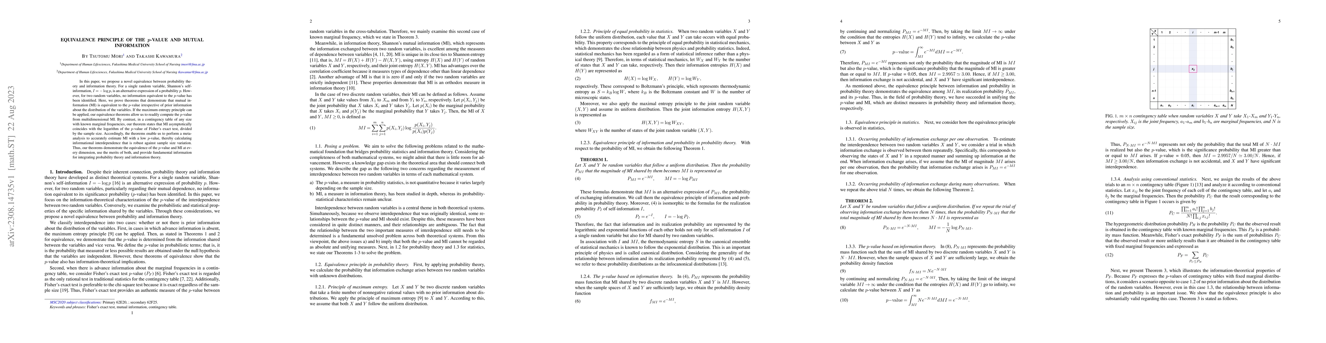 In this paper, we propose a novel equivalence between probability theory and information theory. For a single random variable, Shannon's self-information, $I=-\log {p}$, is an alternative expression of a probability $p$. However, for two random variables, no information equivalent to the $p$-value has been identified. Here, we prove theorems that demonstrate that mutual information (MI) is equivalent to the $p$-value irrespective of prior information about the distribution of the variables. If the maximum entropy principle can be applied, our equivalence theorems allow us to readily compute the $p$-value from multidimensional MI. By contrast, in a contingency table of any size with known marginal frequencies, our theorem states that MI asymptotically coincides with the logarithm of the $p$-value of Fisher's exact test, divided by the sample size. Accordingly, the theorems enable us to perform a meta-analysis to accurately estimate MI with a low $p$-value, thereby calculating informational interdependence that is robust against sample size variation. Thus, our theorems demonstrate the equivalence of the $p$-value and MI at every dimension, use the merits of both, and provide fundamental information for integrating probability theory and information theory.