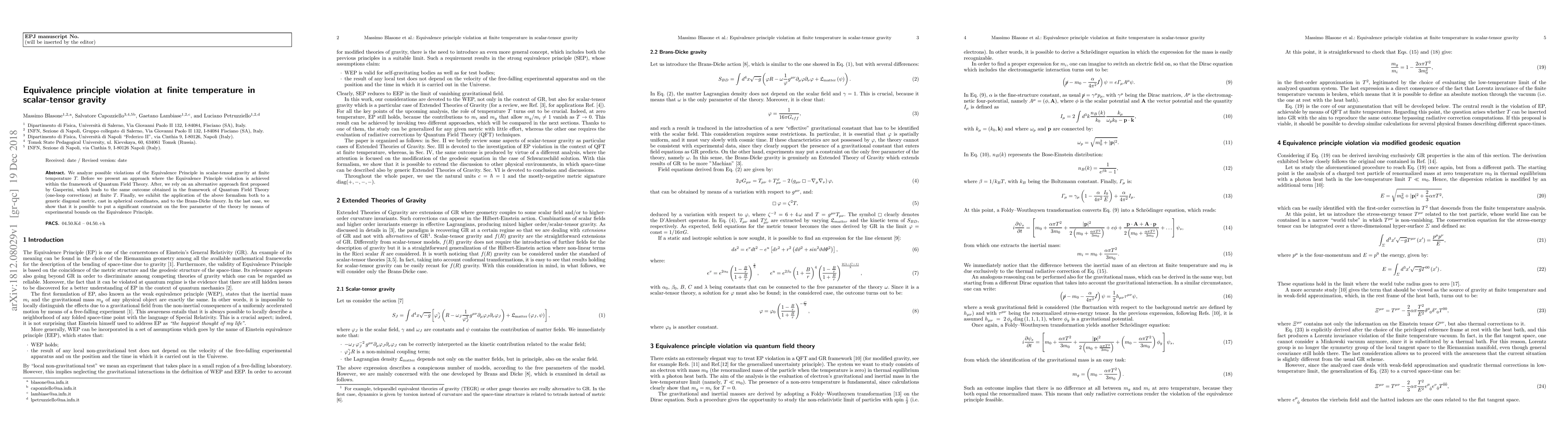 This paper investigates violations of the Equivalence Principle in scalar-tensor gravity at finite temperature, employing both Quantum Field Theory and Gasperini's alternative approach to demonstrate the same outcome. It applies the formalism to spherical coordinates and Brans-Dicke theory, providing constraints on the theory's parameters through experimental Equivalence Principle bounds.