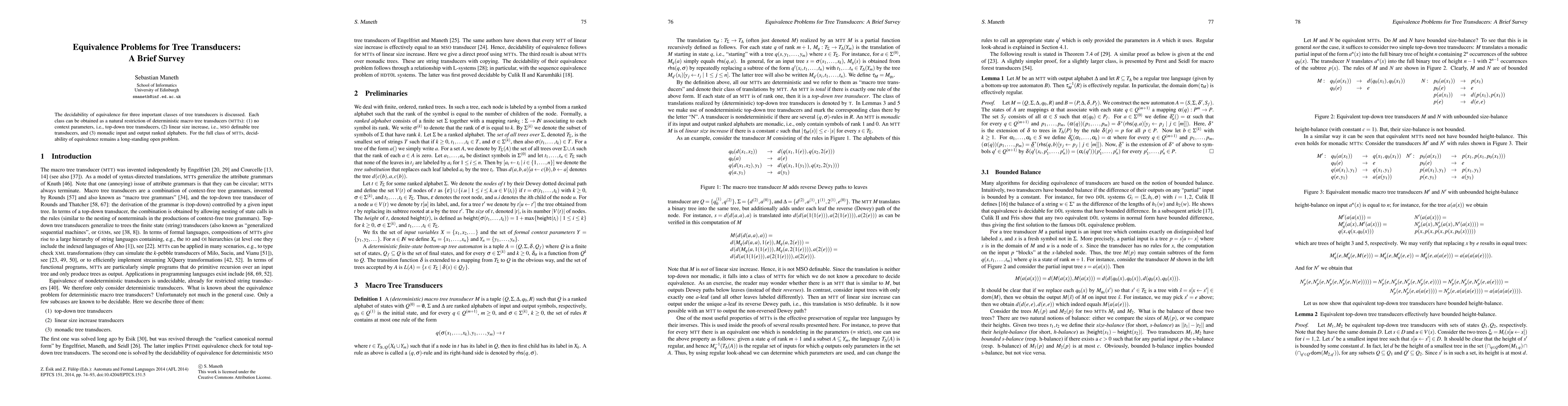 The decidability of equivalence for three important classes of tree transducers is discussed. Each class can be obtained as a natural restriction of deterministic macro tree transducers (MTTs): (1) no context parameters, i.e., top-down tree transducers, (2) linear size increase, i.e., MSO definable tree transducers, and (3) monadic input and output ranked alphabets. For the full class of MTTs, decidability of equivalence remains a long-standing open problem.