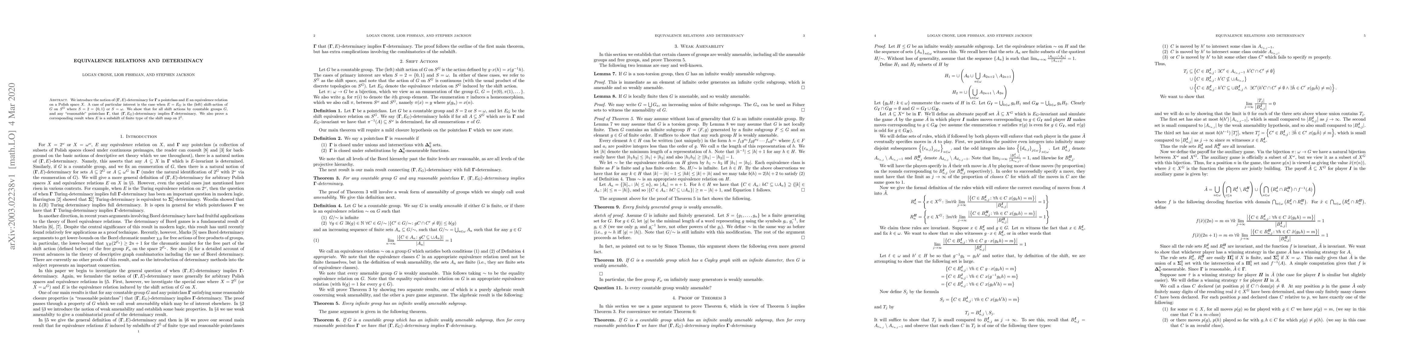 This paper explores $(\Gamma,E)$-determinacy for pointclasses $\Gamma$ and equivalence relations $E$ on Polish spaces, focusing on shift actions by countable groups. It demonstrates that $(\Gamma,E_G)$-determinacy implies $\Gamma$-determinacy for reasonable pointclasses, and similarly proves a result for subshifts of finite type.