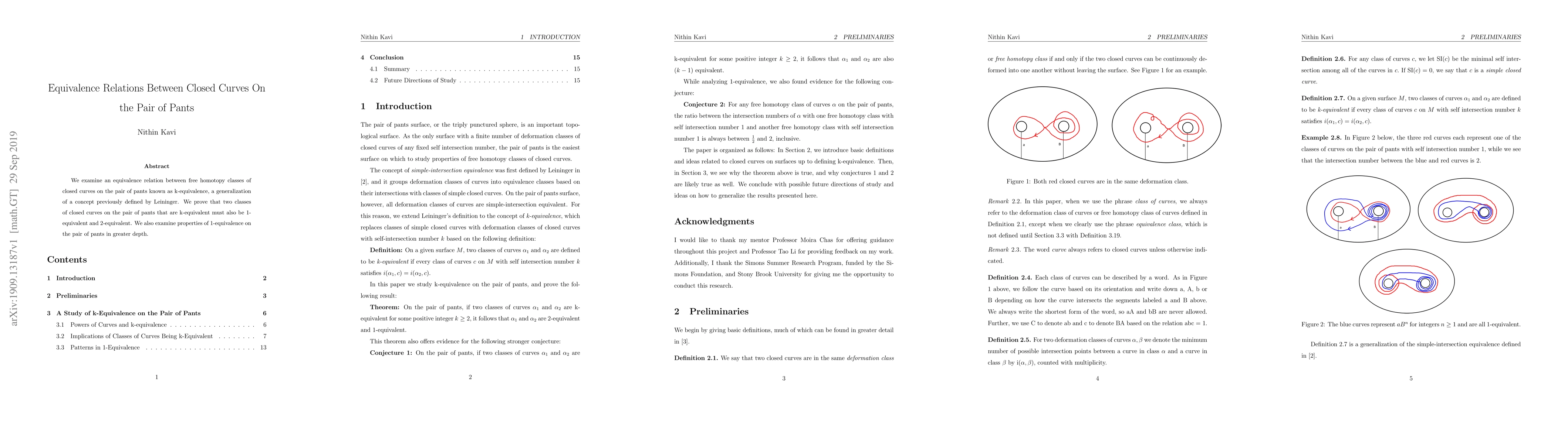 This paper explores k-equivalence, a generalized equivalence relation for closed curves on the pair of pants, proving that k-equivalence implies both 1-equivalence and 2-equivalence. It also delves deeper into the properties of 1-equivalence on this geometric object.