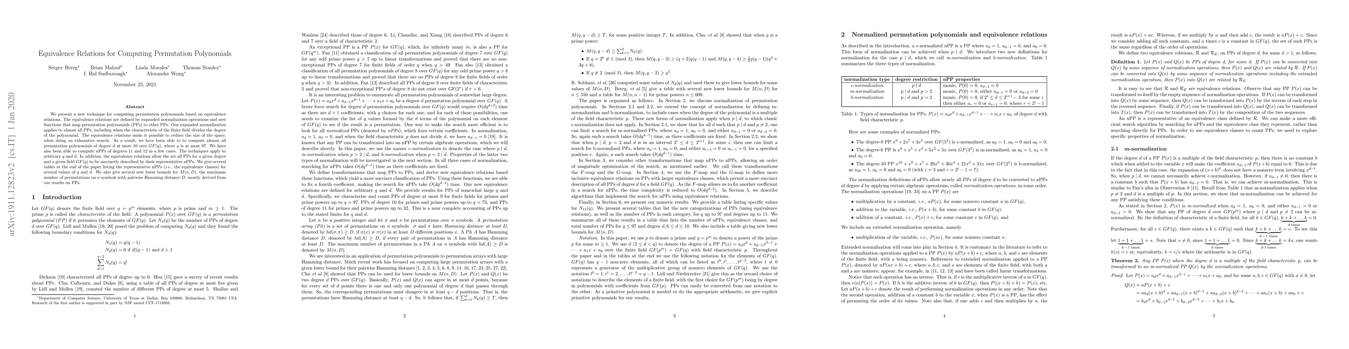 We present a new technique for computing permutation polynomials based on equivalence relations. The equivalence relations are defined by expanded normalization operations and new functions that map permutation polynomials (PPs) to other PPs. Our expanded normalization applies to almost all PPs, including when the characteristic of the finite field divides the degree of the polynomial. The equivalence relations make it possible to reduce the size of the space, when doing an exhaustive search. As a result, we have been able to compute almost all permutation polynomials of degree $d$ at most 10 over $GF(q)$, where $q$ is at most 97. We have also been able to compute nPPs of degrees 11 and 12 in a few cases. The techniques apply to arbitrary $q$ and $d$. In addition, the equivalence relations allow the set all PPs for a given degree and a given field $GF(q)$ to be succinctly described by their representative nPPs. We give several tables at the end of the paper listing the representative nPPs (\ie the equivalence classes) for several values of $q$ and $d$. We also give several new lower bounds for $M(n,D)$, the maximum number of permutations on $n$ symbols with pairwise Hamming distance $D$, mostly derived from our results on PPs.