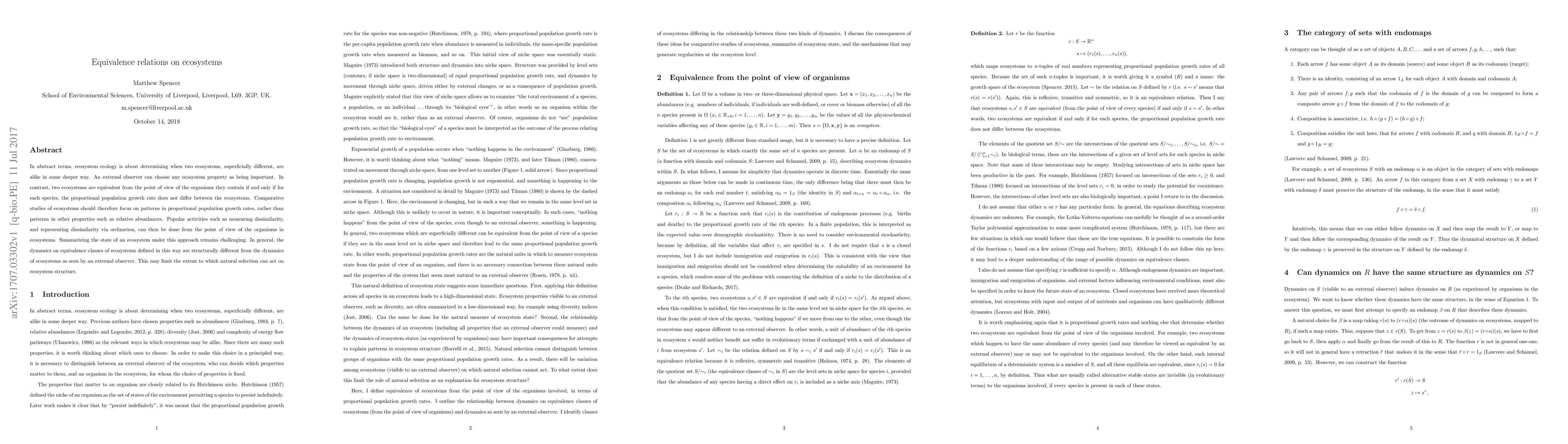 The paper proposes an equivalence relation for ecosystems based on proportional population growth rates of species, rather than external properties. It suggests this organism-centric view changes ecosystem dynamics, potentially impacting natural selection's influence on ecosystem structure.