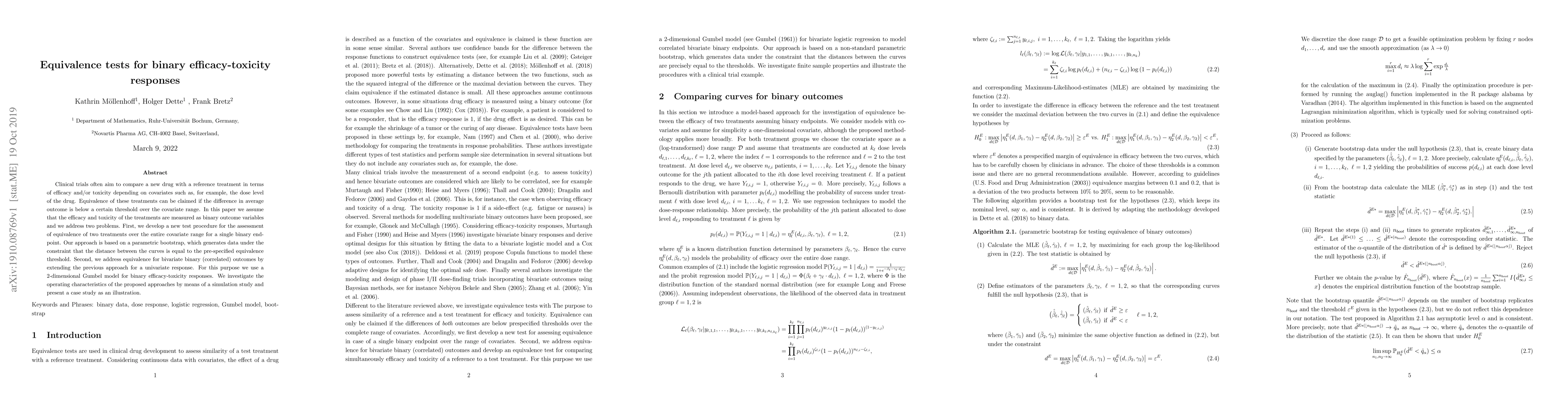 Clinical trials often aim to compare a new drug with a reference treatment in terms of efficacy and/or toxicity depending on covariates such as, for example, the dose level of the drug. Equivalence of these treatments can be claimed if the difference in average outcome is below a certain threshold over the covariate range. In this paper we assume that the efficacy and toxicity of the treatments are measured as binary outcome variables and we address two problems. First, we develop a new test procedure for the assessment of equivalence of two treatments over the entire covariate range for a single binary endpoint. Our approach is based on a parametric bootstrap, which generates data under the constraint that the distance between the curves is equal to the pre-specified equivalence threshold. Second, we address equivalence for bivariate binary (correlated) outcomes by extending the previous approach for a univariate response. For this purpose we use a 2-dimensional Gumbel model for binary efficacy-toxicity responses. We investigate the operating characteristics of the proposed approaches by means of a simulation study and present a case study as an illustration.