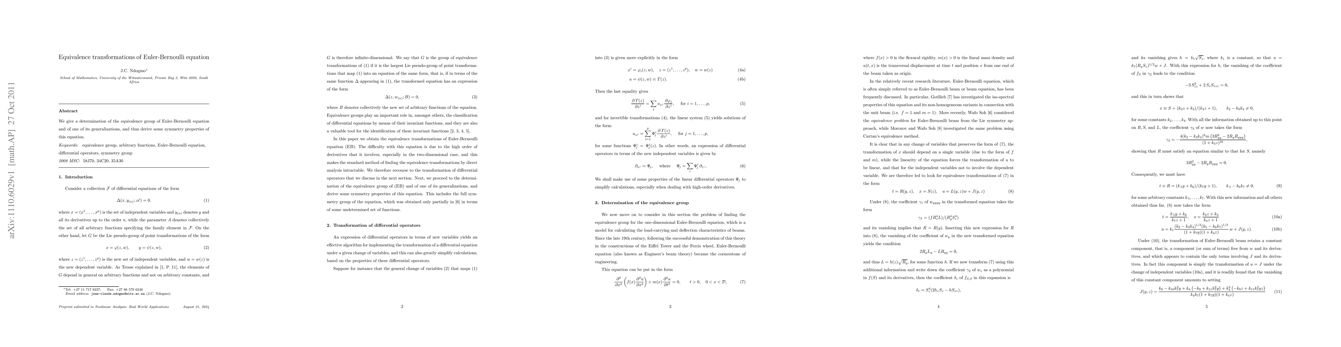 This paper identifies the equivalence group of the Euler-Bernoulli equation and its generalization, deriving symmetry properties and establishing equivalence transformations for these equations. The findings contribute to a deeper understanding of the structural properties of these mathematical models.