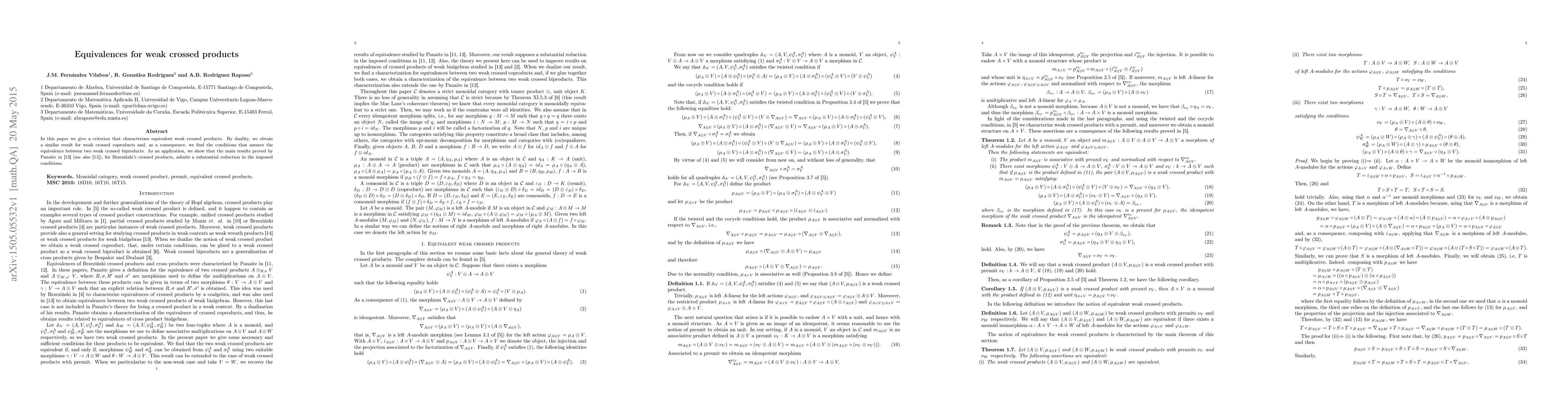 This paper establishes criteria for characterizing equivalent weak crossed products and their duals, weak crossed coproducts, providing conditions for their equivalence and simplifying conditions for Brzezińsky's crossed products as shown by Panaite.