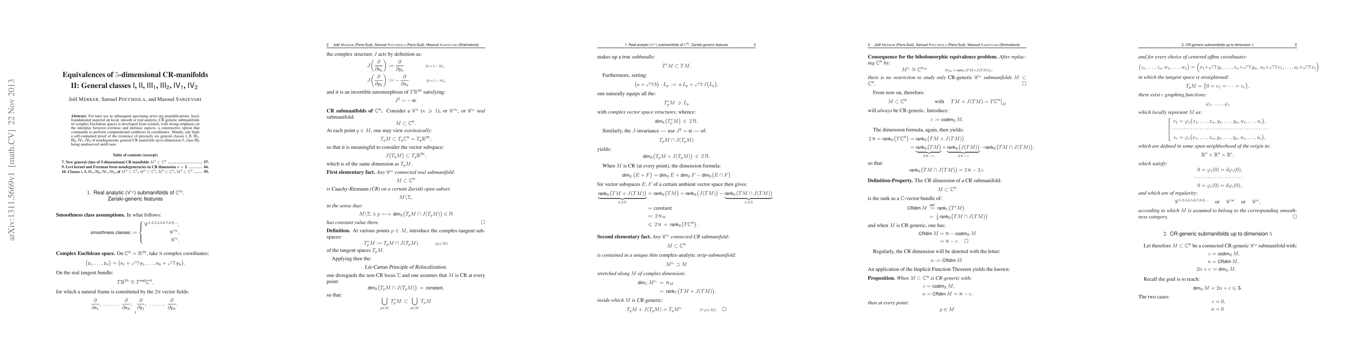 For later use in subsequent upcoming arxiv.org prepublications, basic foundational material on local, smooth or real analytic, CR-generic submanifolds of complex Euclidean spaces is developed from scratch, with strong emphasis on the interplay between extrinsic and intrinsic aspects, a constructive option that commands to perform computational syntheses in coordinates. Mainly, one finds a self-contained proof of the existence of precisely six general classes: I, II, III-1, III-2, IV-1, IV-2 of nondegenerate general CR manifolds up to dimension 5, class III-2 being unobserved untill now.
