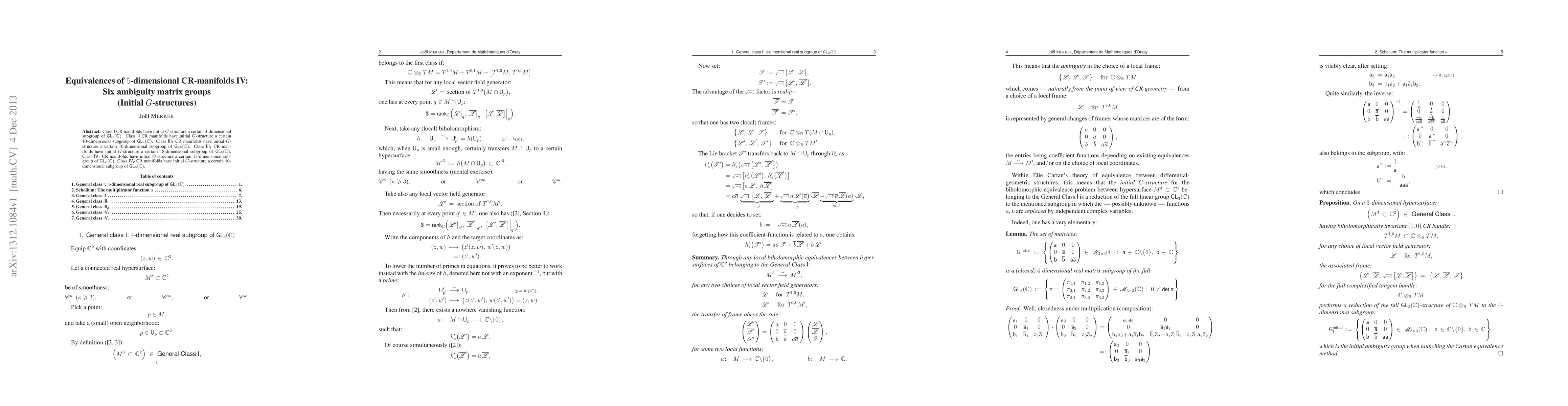 Class I CR manifolds have initial G-structure a certain 4-dimensional subgroup of GL_3(C). Class II CR manifolds have initial G-structure a certain 10-dimensional subgroup of GL_4(C). Class III-1 CR manifolds have initial G-structure a certain 10-dimensional subgroup of GL_5(C). Class III-2 CR manifolds have initial G-structure a certain 18-dimensional subgroup of GL_5(C). Class IV-1 CR manifolds have initial G-structure a certain 13-dimensional subgroup of GL_5(C). Class IV-2 CR manifolds have initial G-structure a certain 10-dimensional subgroup of GL_5(C).