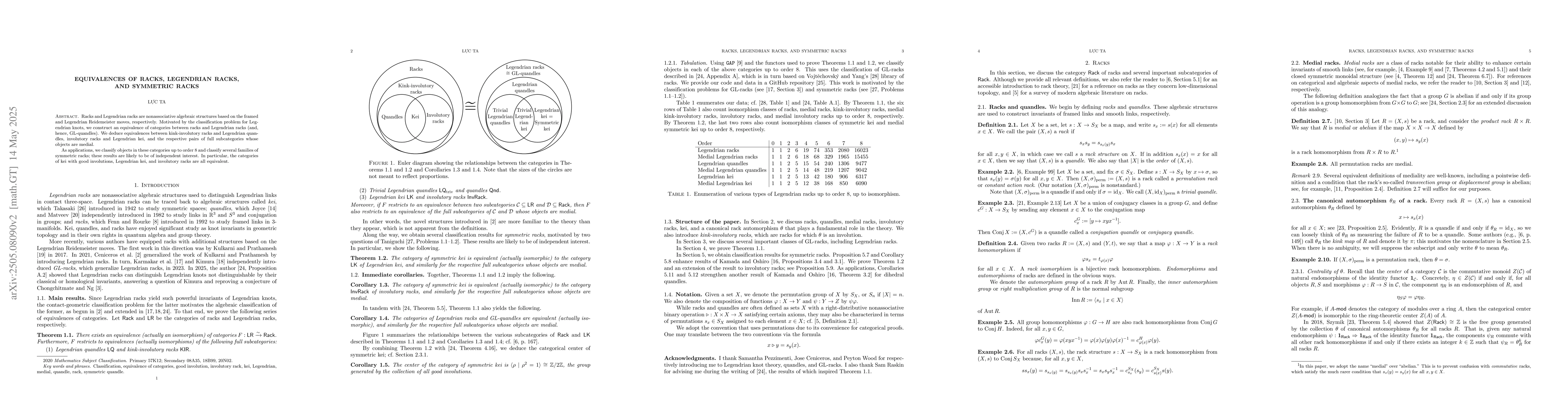 Researchers establish equivalences between racks, Legendrian racks, and symmetric racks, leading to classifications of objects up to order 8 and independent interest results in categories such as GL-quandles, involutory racks, and Legendrian kei.