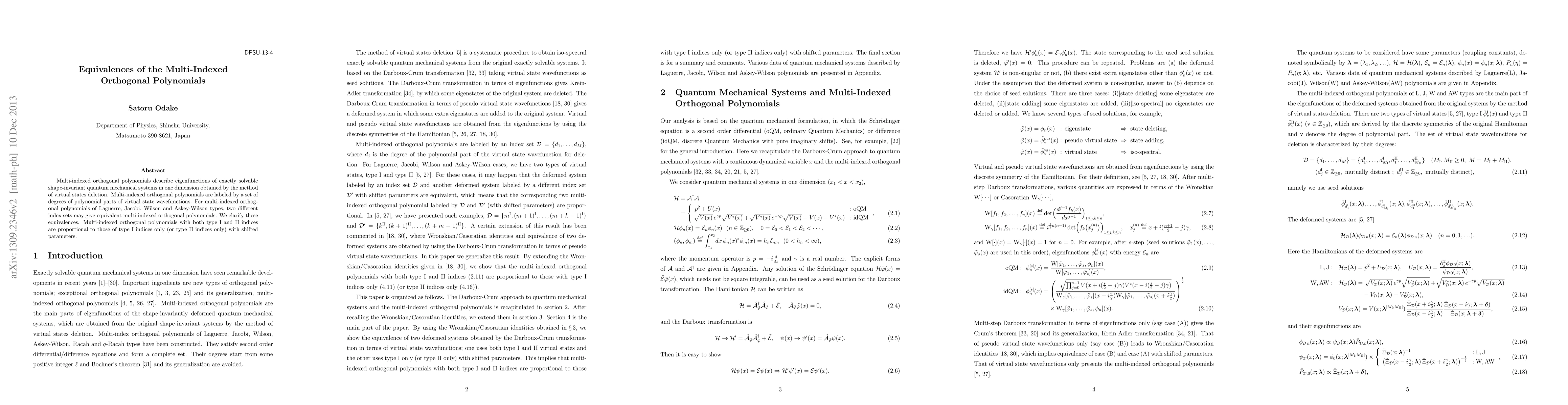 This paper clarifies the equivalences between different index sets of multi-indexed orthogonal polynomials, including Laguerre, Jacobi, Wilson, and Askey-Wilson types. It shows that polynomials labeled by type I and II indices are proportional to those labeled by only type I or type II indices with shifted parameters.