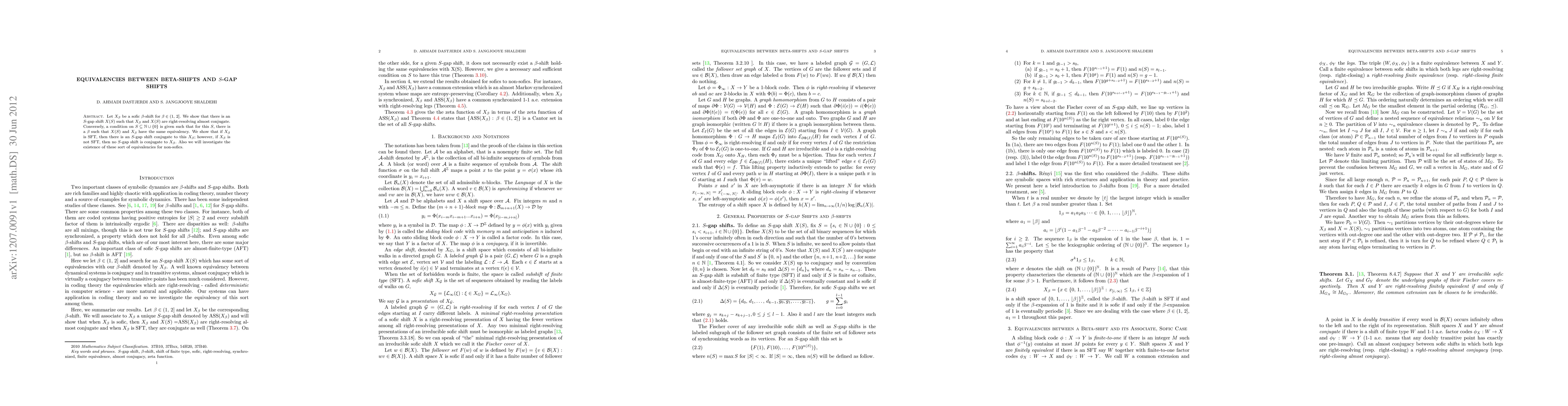 This paper establishes equivalencies between sofic $\beta$-shifts and $S$-gap shifts, demonstrating that they are right-resolving almost conjugate. It also explores conditions under which these shifts have the same equivalency and examines the case when $\beta$-shifts are SFT versus non-SFT.