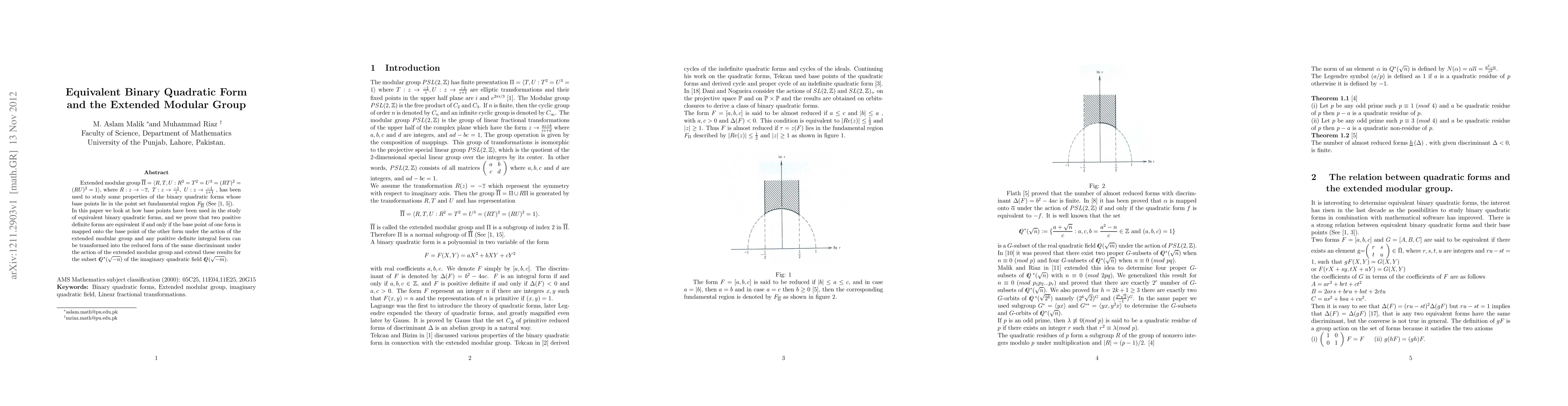 This paper explores the use of base points in studying equivalent binary quadratic forms via the extended modular group. It proves that two positive definite forms are equivalent if one base point maps onto the other under this group's action. The research also extends these results to a subset of imaginary quadratic fields.
