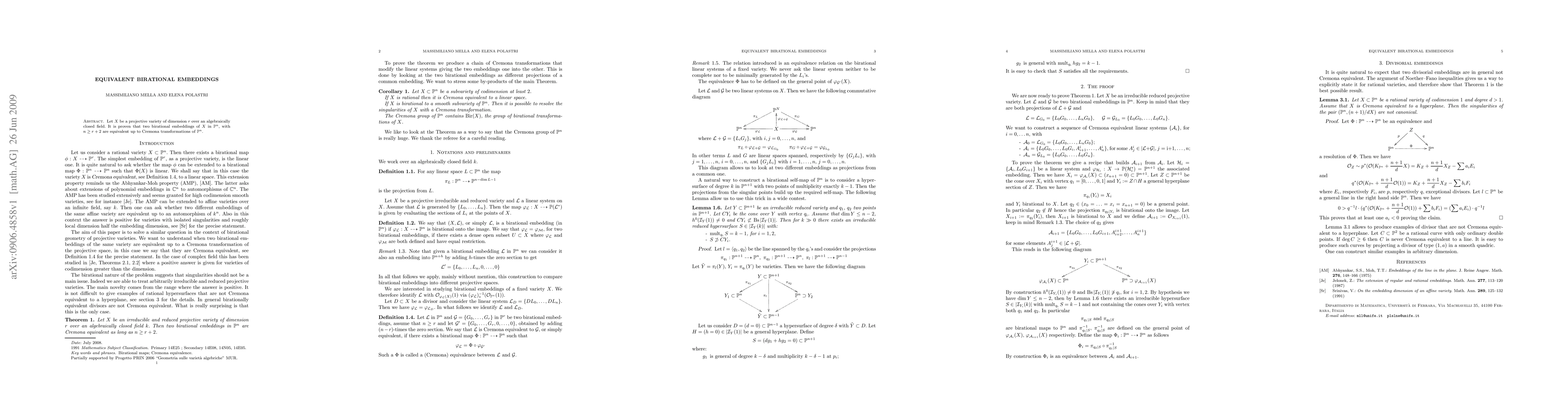Let $X$ be a projective variety of dimension $r$ over an algebraically closed field. It is proven that two birational embeddings of $X$ in $\P^n$, with $n\geq r+2$ are equivalent up to Cremona transformations of $\P^n$.