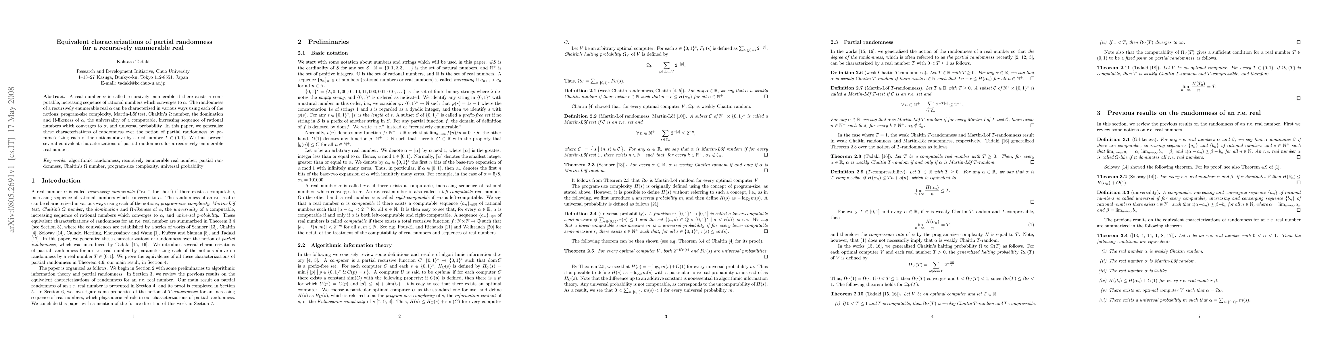 This paper explores various characterizations of randomness for recursively enumerable real numbers, generalizing these to partial randomness by introducing a parameter T∈(0,1]. It presents several equivalent characterizations of partial randomness using notions like program-size complexity and Martin-Löf test.