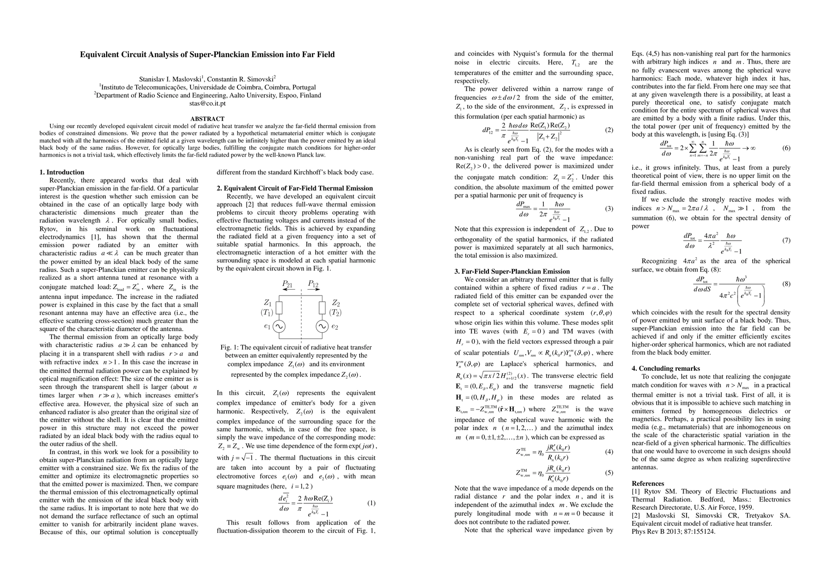 Using our recently developed equivalent circuit model of radiative heat transfer we analyze the far-field thermal emission from bodies of constrained dimensions. We prove that the power radiated by a hypothetical metamaterial emitter which is conjugate matched with all the harmonics of the emitted field at a given wavelength can be infinitely higher than the power emitted by an ideal black body of the same radius. However, for optically large bodies, fulfilling the conjugate match conditions for higher-order harmonics is not a trivial task, which effectively limits the far-field radiated power by the well-known Planck law.