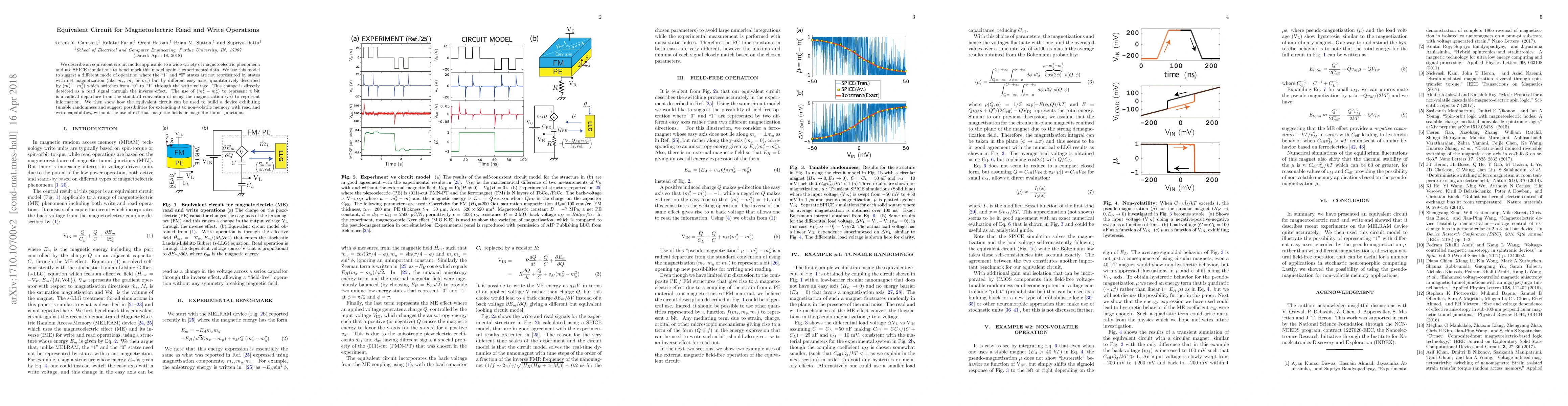 We describe an equivalent circuit model applicable to a wide variety of magnetoelectric phenomena and use SPICE simulations to benchmark this model against experimental data. We use this model to suggest a different mode of operation where the "1" and "0'" states are not represented by states with net magnetization (like $m_x$, $m_y$ or $m_z$) but by different easy axes, quantitatively described by ($m_x^2 - m_y^2$) which switches from "0" to "1" through the write voltage. This change is directly detected as a read signal through the inverse effect. The use of ($m_x^2 - m_y^2$) to represent a bit is a radical departure from the standard convention of using the magnetization ($m$) to represent information. We then show how the equivalent circuit can be used to build a device exhibiting tunable randomness and suggest possibilities for extending it to non-volatile memory with read and write capabilities, without the use of external magnetic fields or magnetic tunnel junctions.