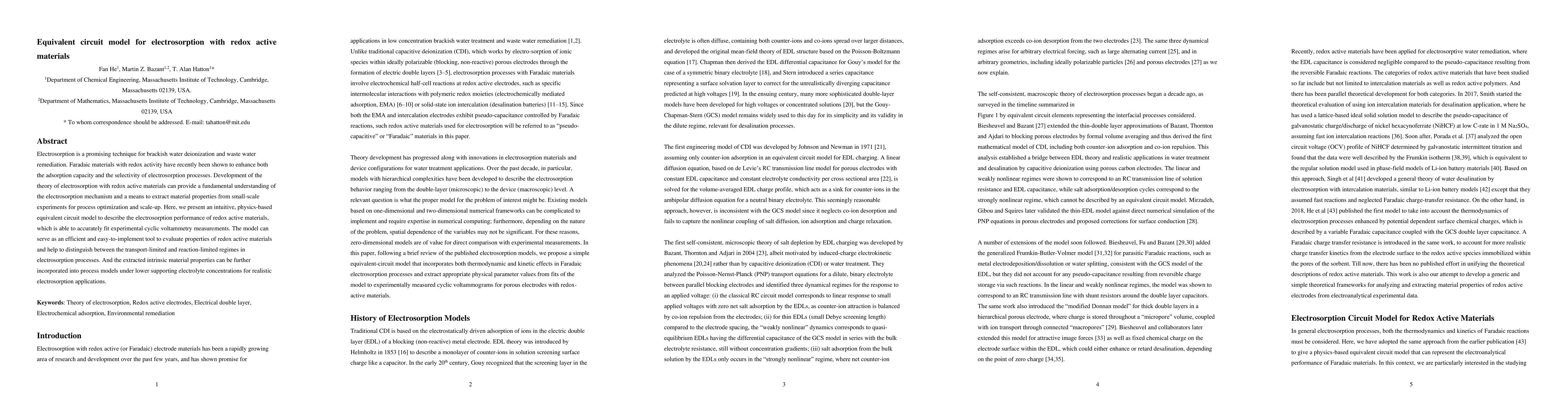 Researchers developed an equivalent circuit model to understand electrosorption with redox active materials, improving deionization and waste remediation processes. The model accurately fits experimental data and can extract material properties for process optimization.