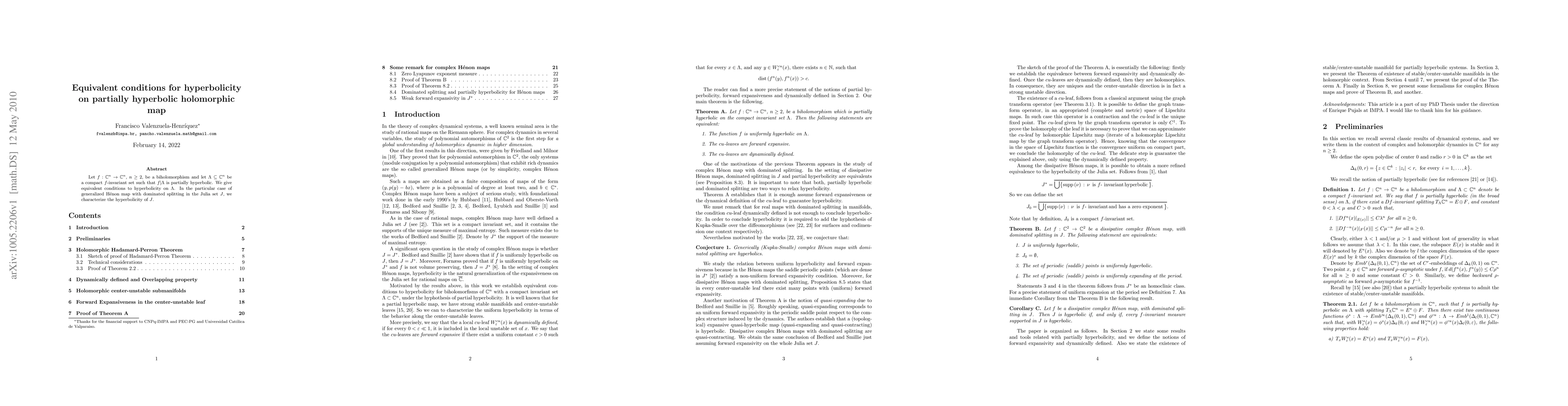 This paper provides equivalent conditions for hyperbolicity on partially hyperbolic holomorphic maps, specifically focusing on the biholomorphism $f:\mathbb{C}^n \to \mathbb{C}^n$, $n\geq2$, and a compact $f$-invariant set $\Lambda$. It also characterizes hyperbolicity in the context of generalized Hénon maps with dominated splitting within the Julia set $J$.