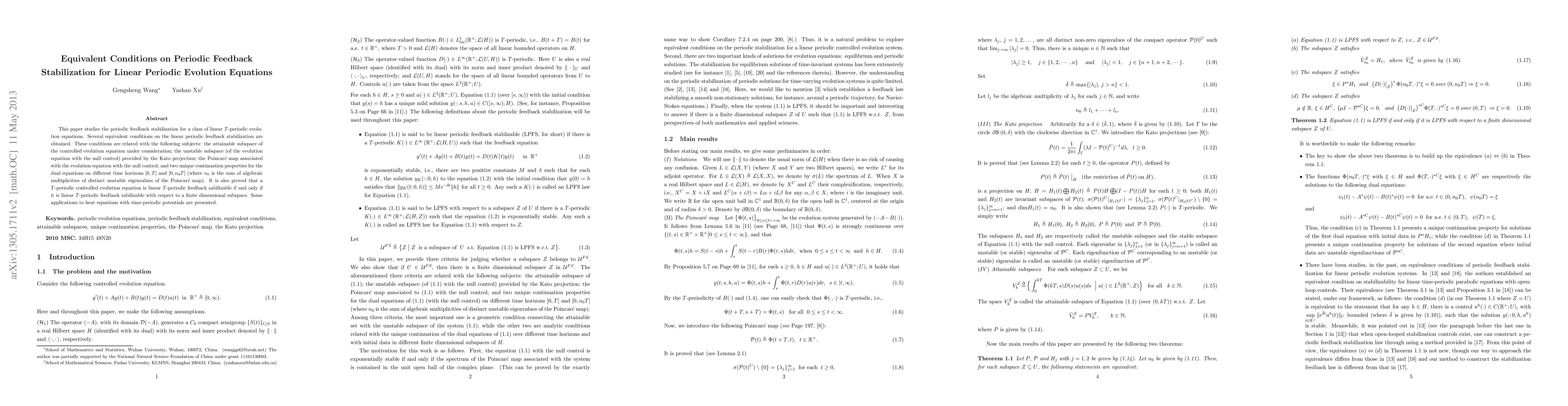 This paper investigates the periodic feedback stabilization of linear $T$-periodic evolution equations, deriving several equivalent conditions linked to the controlled evolution's attainable subspace, unstable subspace, Poincaré map, and unique continuation properties. It concludes that such equations are stabilizable if stabilizable within a finite-dimensional subspace, with applications to heat equations with time-periodic potentials.