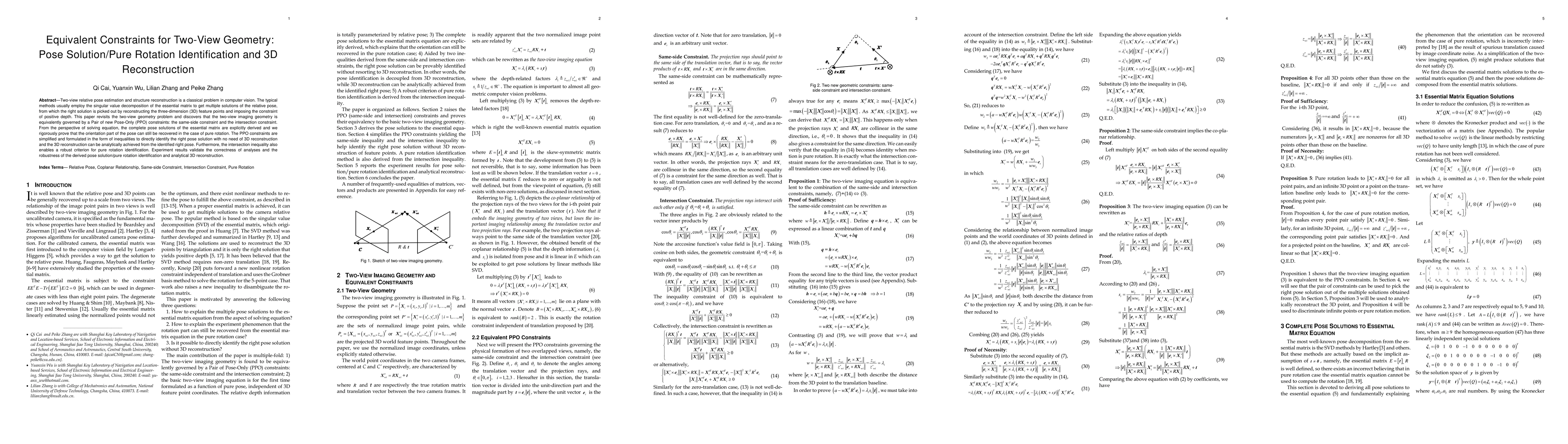 Two-view relative pose estimation and structure reconstruction is a classical problem in computer vision. The typical methods usually employ the singular value decomposition of the essential matrix to get multiple solutions of the relative pose, from which the right solution is picked out by reconstructing the three-dimension (3D) feature points and imposing the constraint of positive depth. This paper revisits the two-view geometry problem and discovers that the two-view imaging geometry is equivalently governed by a Pair of new Pose-Only (PPO) constraints: the same-side constraint and the intersection constraint. From the perspective of solving equation, the complete pose solutions of the essential matrix are explicitly derived and we rigorously prove that the orientation part of the pose can still be recovered in the case of pure rotation. The PPO constraints are simplified and formulated in the form of inequalities to directly identify the right pose solution with no need of 3D reconstruction and the 3D reconstruction can be analytically achieved from the identified right pose. Furthermore, the intersection inequality also enables a robust criterion for pure rotation identification. Experiment results validate the correctness of analyses and the robustness of the derived pose solution/pure rotation identification and analytical 3D reconstruction.