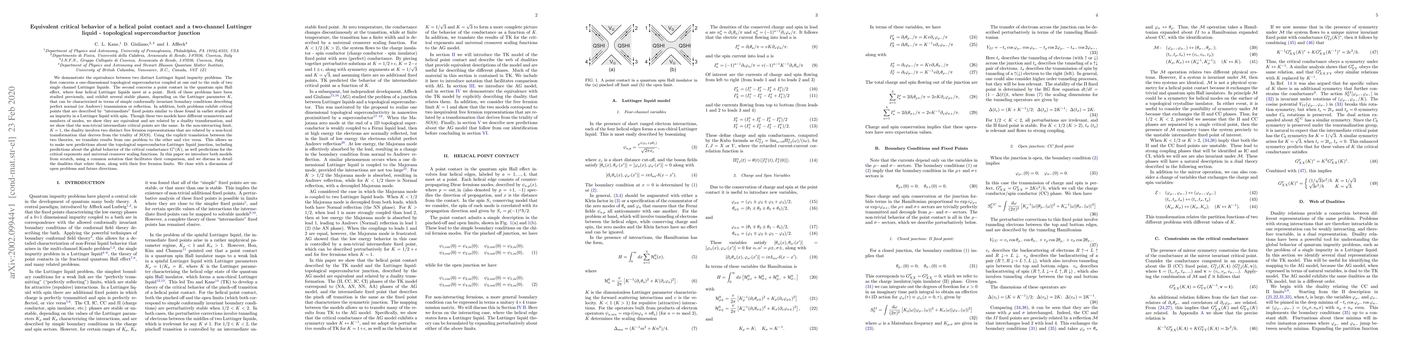 We demonstrate the equivalence between two distinct Luttinger liquid impurity problems. The first concerns a one-dimensional topological superconductor coupled at one end to the ends of two single channel Luttinger liquids. The second concerns a point contact in the quantum spin Hall effect, where four helical Luttinger liquids meet at a point. Both problems have been studied previously and exhibit several stable phases depending on the Luttinger parameter K, that can be characterized in terms of simple conformally invariant boundary conditions describing perfect normal (or Andreev) transmission or reflection. In addition, both problems exhibit critical points that are described by "intermediate" fixed points similar to those found in earlier studies of an impurity in a Luttinger liquid with spin. Though these two models have different symmetries and numbers of modes, we show they are equivalent and are related by a duality transformation, and we show that the non-trivial intermediate critical points are the same. In the non-interacting limit, K=1, the duality involves two distinct free fermion representations that are related by a non-local transformation that derives from the triality of SO(8). Using the explicit translation between the two theories, we translate results from one problem to the other and vice versa. This allows us to make new predictions about the topological superconductor-Luttinger liquid junction, including predictions about the global behavior of the critical conductance G*(K), as well predictions for the critical exponents and universal crossover scaling functions. In this paper we introduce both models from scratch, using a common notation that facilitates their comparison, and we discuss in detail the dualities that relate them, along with their free fermion limits. We close with a discussion of open problems and future directions.