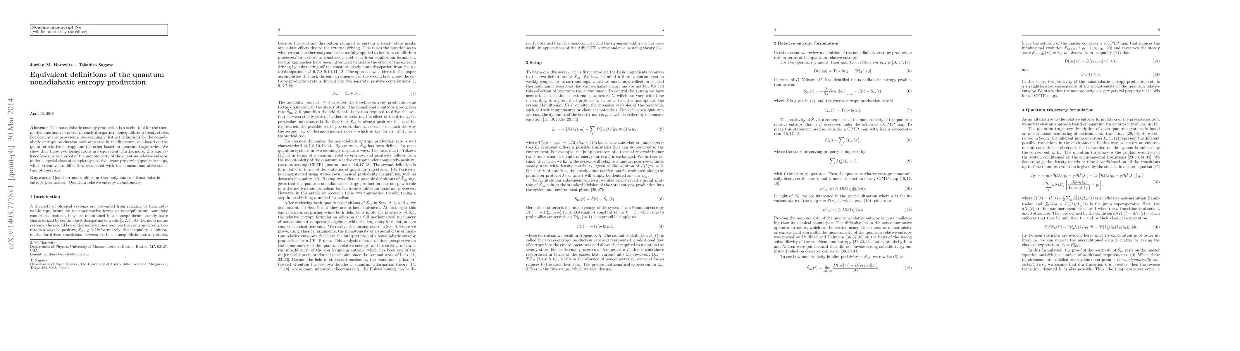 The nonadiabatic entropy production is a useful tool for the thermodynamic analysis of continuously dissipating, nonequilibrium steady states. For open quantum systems, two seemingly distinct definitions for the nonadiabatic entropy production have appeared in the literature, one based on the quantum relative entropy and the other based on quantum trajectories. We show that these two formulations are equivalent. Furthermore, this equivalence leads us to a proof of the monotonicity of the quantum relative entropy under a special class of completely-positive, trace-preserving quantum maps, which circumvents difficulties associated with the noncommuntative structure of operators.