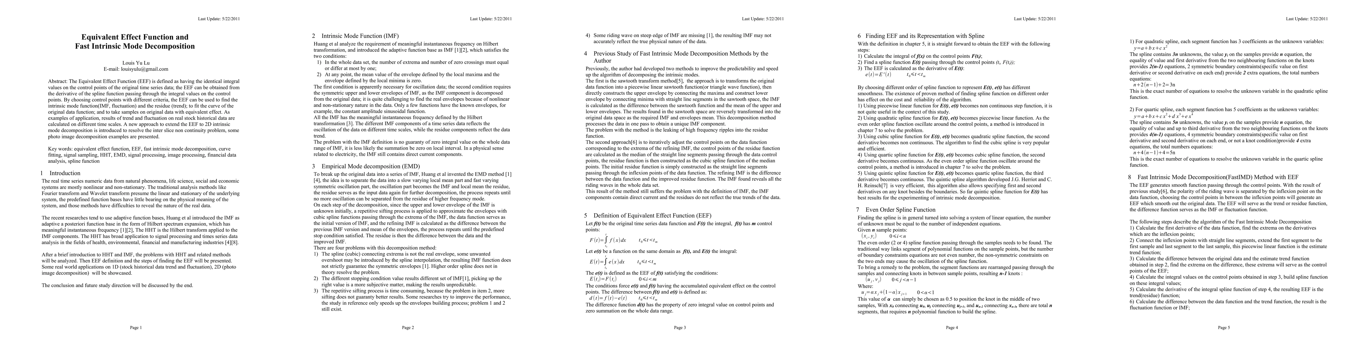 The Equivalent Effect Function (EEF) is defined as having the identical integral values on the control points of the original time series data; the EEF can be obtained from the derivative of the spline function passing through the integral values on the control points. By choosing control points with different criteria, the EEF can be used to find the intrinsic mode function(IMF, fluctuation) and the residue (trend); to fit the curve of the original data function; and to take samples on original data with equivalent effect. As examples of application, results of trend and fluctuation on real stock historical data are calculated on different time scales. A new approach to extend the EEF to 2D intrinsic mode decomposition is introduced to resolve the inter slice non continuity problem, some photo image decomposition examples are presented.