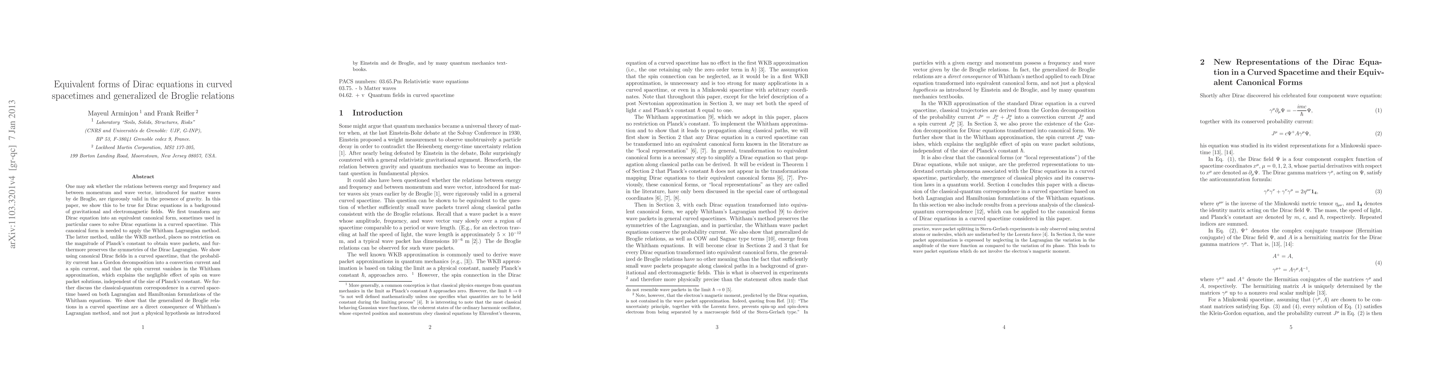 One may ask whether the relations between energy and frequency and between momentum and wave vector, introduced for matter waves by de Broglie, are rigorously valid in the presence of gravity. In this paper, we show this to be true for Dirac equations in a background of gravitational and electromagnetic fields. We first transform any Dirac equation into an equivalent canonical form, sometimes used in particular cases to solve Dirac equations in a curved spacetime. This canonical form is needed to apply the Whitham Lagrangian method. The latter method, unlike the WKB method, places no restriction on the magnitude of Planck's constant to obtain wave packets, and furthermore preserves the symmetries of the Dirac Lagrangian. We show using canonical Dirac fields in a curved spacetime, that the probability current has a Gordon decomposition into a convection current and a spin current, and that the spin current vanishes in the Whitham approximation, which explains the negligible effect of spin on wave packet solutions, independent of the size of Planck's constant. We further discuss the classical-quantum correspondence in a curved spacetime based on both Lagrangian and Hamiltonian formulations of the Whitham equations. We show that the generalized de Broglie relations in a curved spacetime are a direct consequence of Whitham's Lagrangian method, and not just a physical hypothesis as introduced by Einstein and de Broglie, and by many quantum mechanics textbooks.