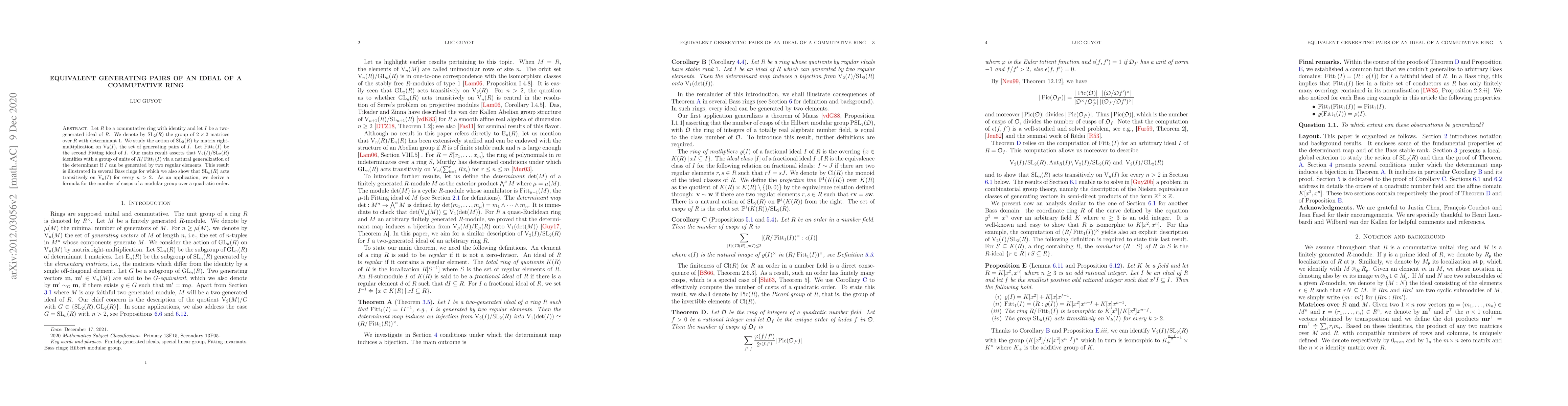 Let $R$ be a commutative ring with identity and let $I$ be a two-generated ideal of $R$. We denote by $\operatorname{SL}_2(R)$ the group of $2 \times 2$ matrices over $R$ with determinant $1$. We study the action of $\operatorname{SL}_2(R)$ by matrix right-multiplication on $\operatorname{V}_2(I)$, the set of generating pairs of $I$. Let $\operatorname{Fitt}_1(I)$ be the second Fitting ideal of $I$. Our main result asserts that $\operatorname{V}_2(I)/\operatorname{SL}_2(R)$ identifies with a group of units of $R/\operatorname{Fitt}_1(I)$ via a natural generalization of the determinant if $I$ can be generated by two regular elements. This result is illustrated in several Bass rings for which we also show that $\operatorname{SL}_n(R)$ acts transitively on $\operatorname{V}_n(I)$ for every $n > 2$. As an application, we derive a formula for the number of cusps of a modular group over a quadratic order.