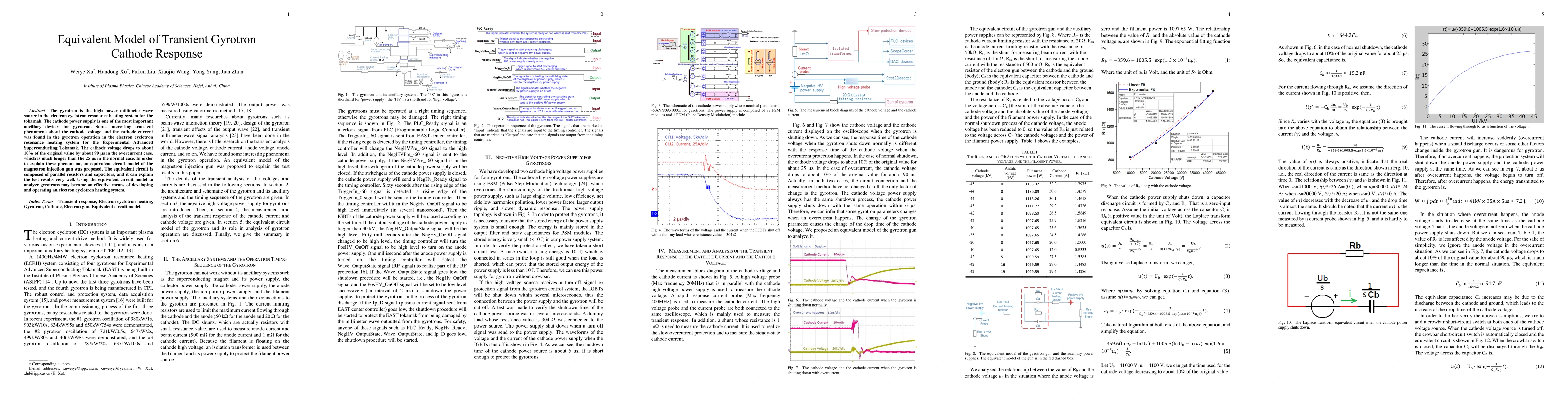 This paper proposes an equivalent circuit model of the magnetron injection gun to explain transient phenomena in the cathode response of a gyrotron, particularly the significant voltage drop during overcurrent conditions. The model, consisting of parallel resistors and capacitors, effectively explains the observed behavior and may aid in the development and operation of electron cyclotron heating systems.
