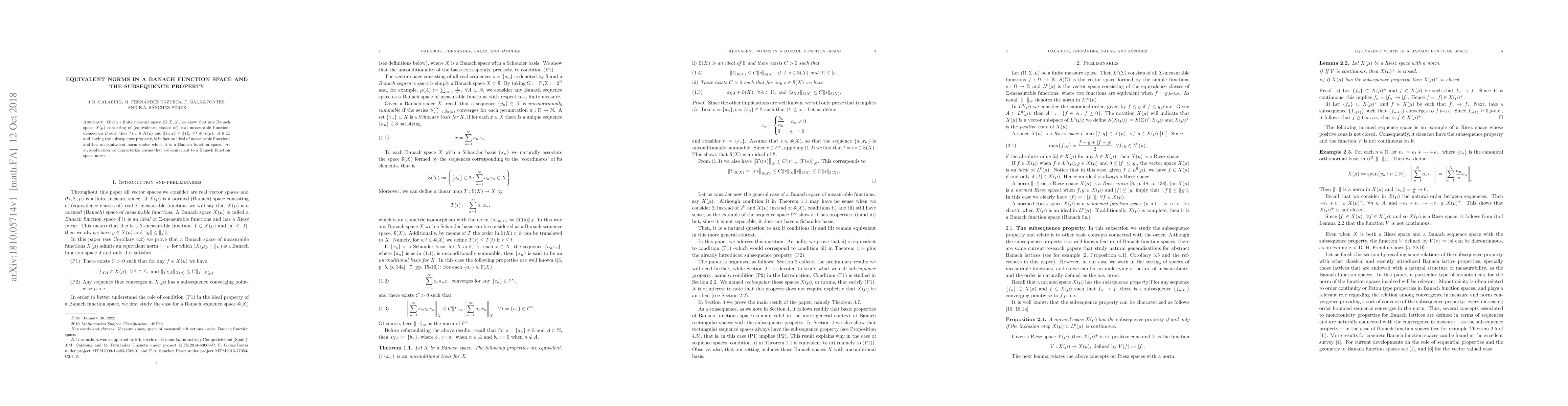 The research focuses on Banach function spaces with a finite measure space (Ω, Σ, μ), examining conditions under which these spaces have equivalent norms and the subsequence property.