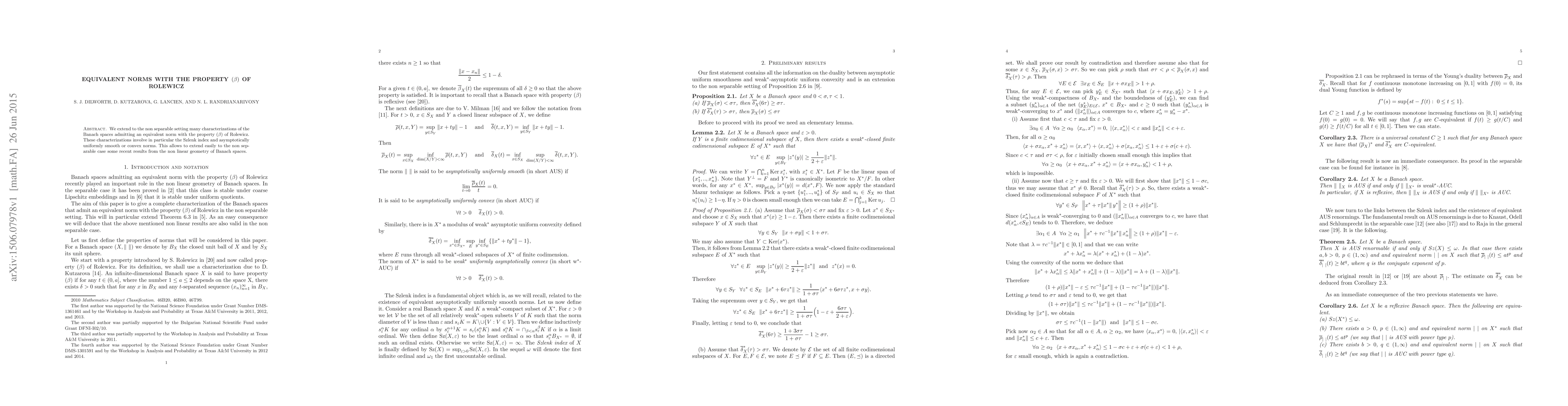 We extend to the non separable setting many characterizations of the Banach spaces admitting an equivalent norm with the property $(\beta)$ of Rolewicz. These characterizations involve in particular the Szlenk index and asymptotically uniformly smooth or convex norms. This allows to extend easily to the non separable case some recent results from the non linear geometry of Banach spaces.