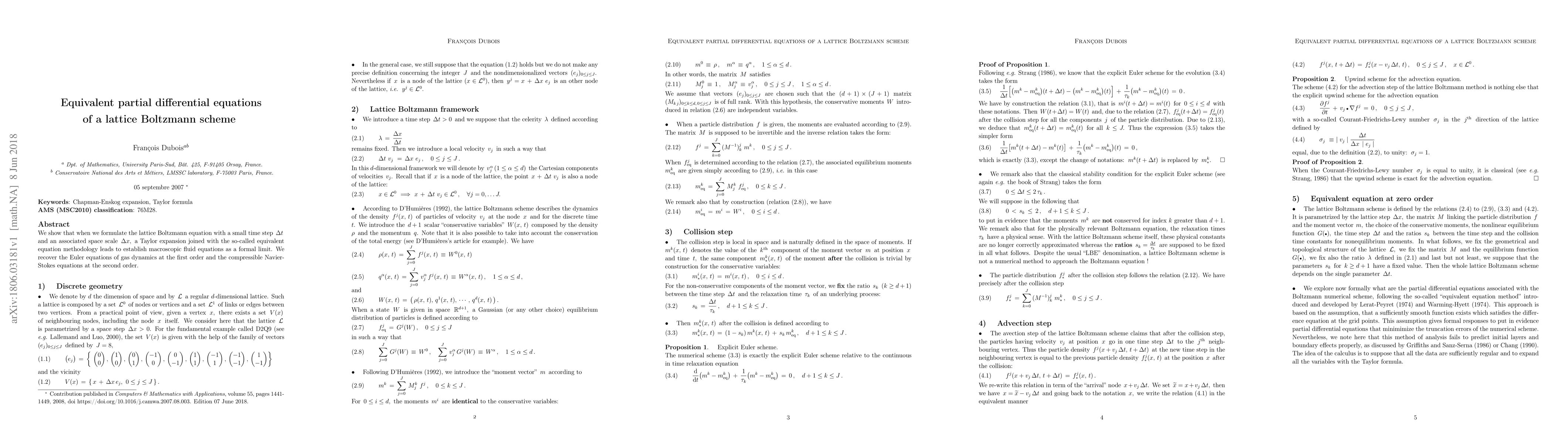 The paper presents a detailed derivation of macroscopic fluid equations from a lattice Boltzmann scheme using Taylor expansion and equivalent equation method, providing a rigorous mathematical foundation for lattice Boltzmann methods.