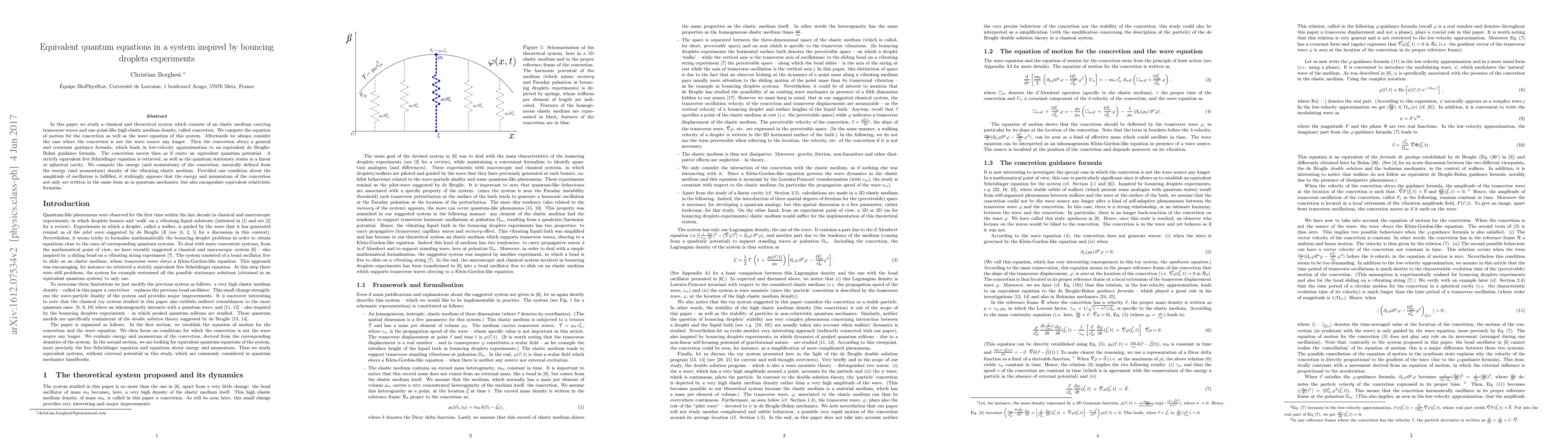 In this paper we study a classical and theoretical system which consists of an elastic medium carrying transverse waves and one point-like high elastic medium density, called concretion. We compute the equation of motion for the concretion as well as the wave equation of this system. Afterwards we always consider the case where the concretion is not the wave source any longer. Then the concretion obeys a general and covariant guidance formula, which leads in low-velocity approximation to an equivalent de Broglie-Bohm guidance formula. The concretion moves then as if exists an equivalent quantum potential. A strictly equivalent free Schr\"odinger equation is retrieved, as well as the quantum stationary states in a linear or spherical cavity. We compute the energy (and momentum) of the concretion, naturally defined from the energy (and momentum) density of the vibrating elastic medium. Provided one condition about the amplitude of oscillation is fulfilled, it strikingly appears that the energy and momentum of the concretion not only are written in the same form as in quantum mechanics, but also encapsulate equivalent relativistic formulas.