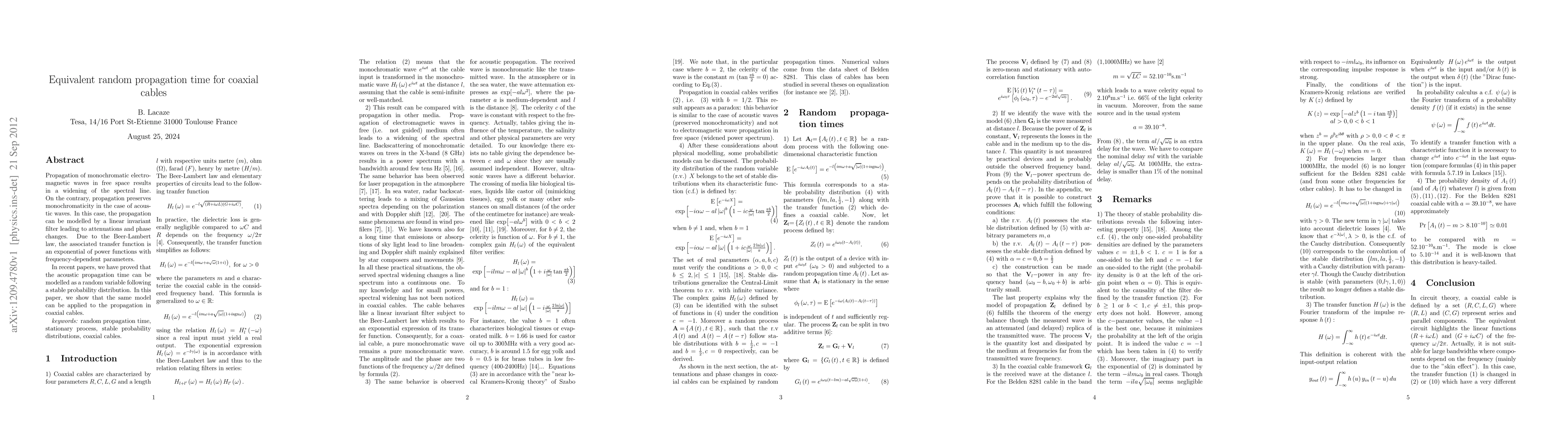 Propagation of monochromatic electromagnetic waves in free space results in a widening of the spectral line. On the contrary, propagation preserves monochromaticity in the case of acoustic waves. In this case, the propagation can be modelled by a linear invariant filter leading to attenuations and phases changes. Due to the Beer-Lambert law, the associated transfer function is an exponential of power functions with frequency-dependent parameters. In recent papers, we have proved that the acoustic propagation time can be modelled as a random variable following a stable probability distribution. In this paper, we show that the same model can be applied to the propagation in coaxial cables.
