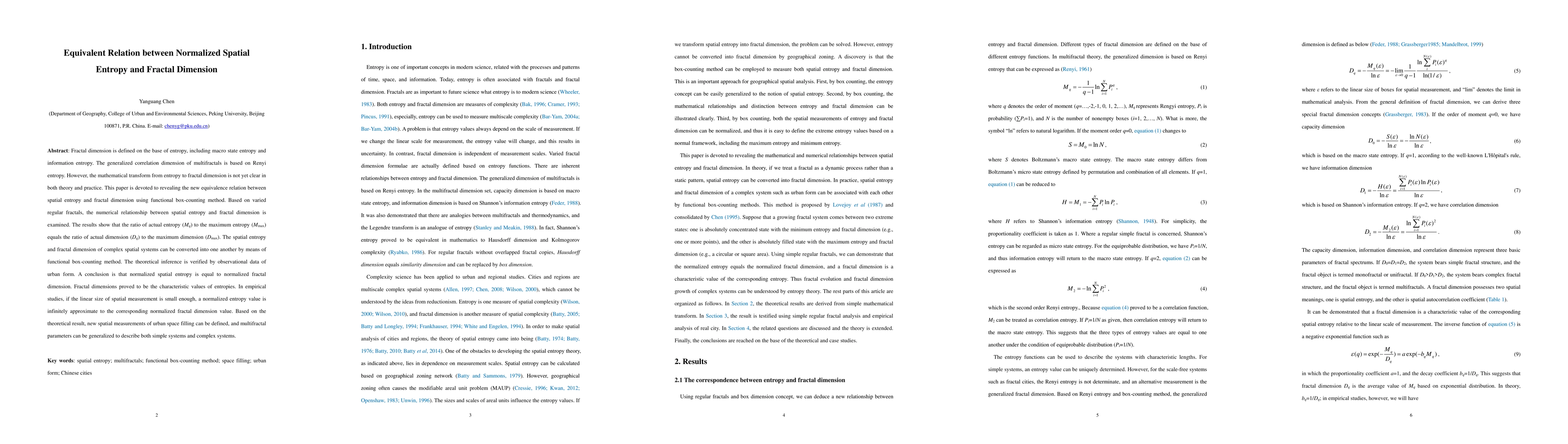 This paper establishes a new equivalence relation between normalized spatial entropy and fractal dimension using the functional box-counting method. It demonstrates that normalized spatial entropy equals normalized fractal dimension, providing a theoretical basis for new spatial measurements of urban space filling and multifractal parameter generalization.