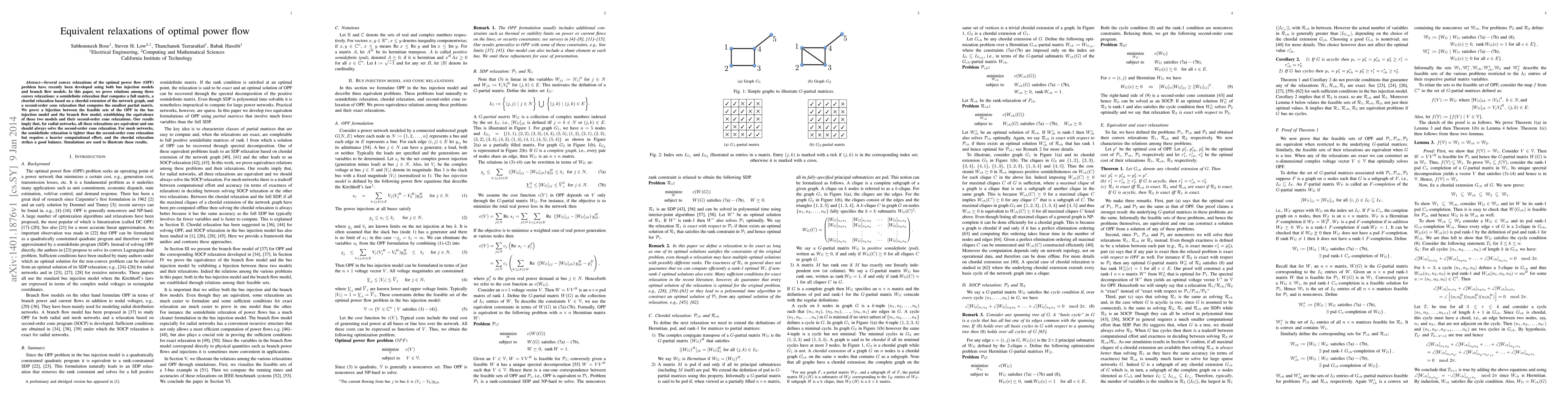 This paper investigates convex relaxations of the optimal power flow (OPF) problem, proving equivalence among three relaxations: semidefinite, chordal, and second-order cone. It establishes that for radial networks, all these relaxations yield the same results, recommending the second-order cone relaxation. For mesh networks, the semidefinite relaxation is tighter but more computationally demanding, while the chordal relaxation offers a balanced approach.