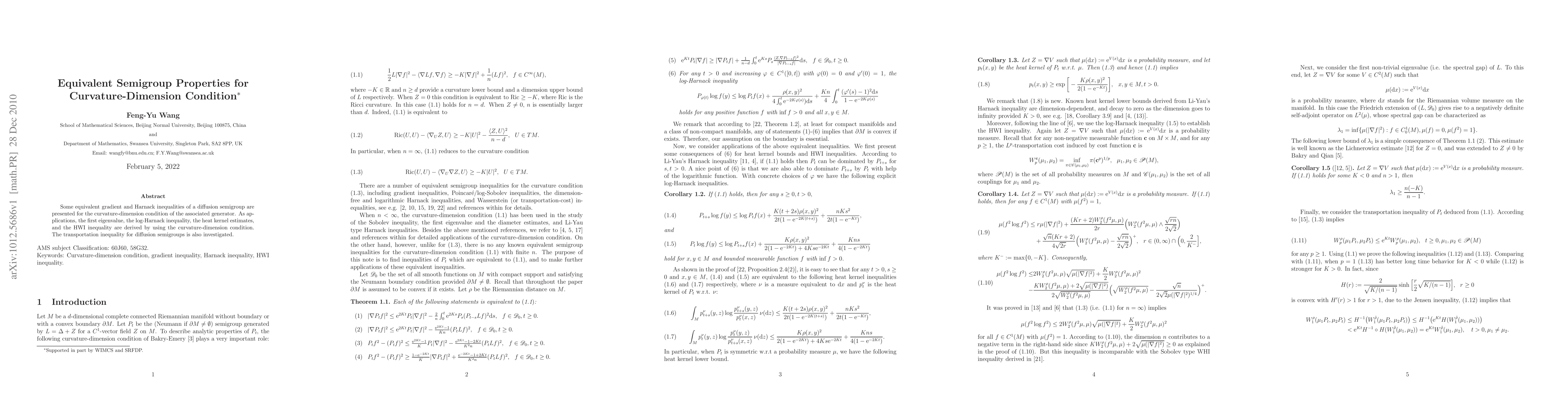 This paper establishes equivalent semigroup properties for the curvature-dimension condition, deriving gradient and Harnack inequalities, and applying these to obtain results like the first eigenvalue, log-Harnack inequality, heat kernel estimates, and the HWI inequality. It also explores the transportation inequality for diffusion semigroups.