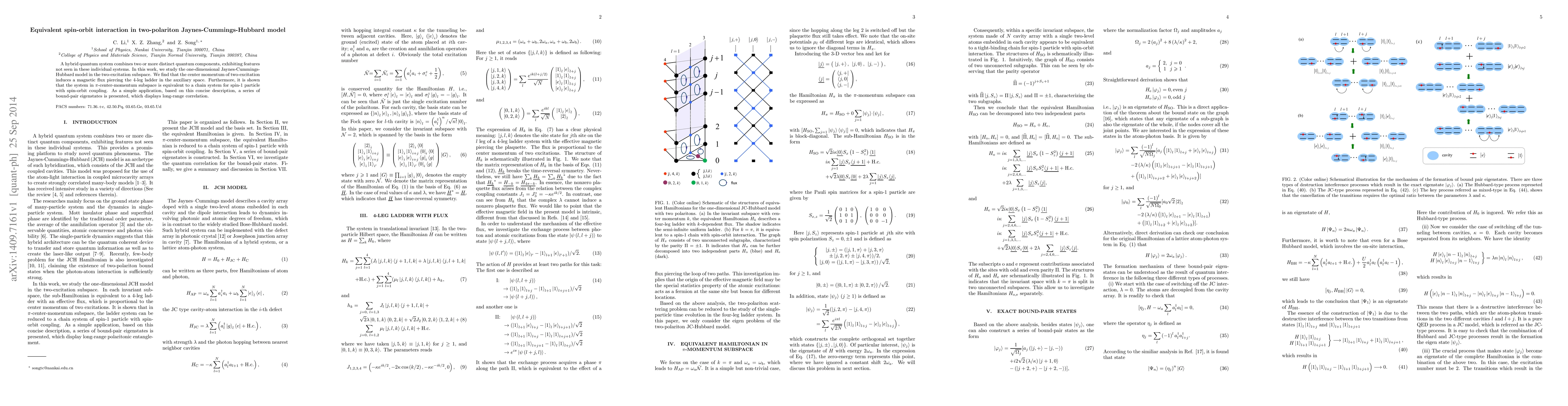 This paper investigates the one-dimensional Jaynes-Cummings-Hubbard model in the two-excitation subspace, revealing that the center momentum induces a magnetic flux in the auxiliary space. It demonstrates equivalence of the system in the π-center-momentum subspace to a spin-1 particle chain with spin-orbit coupling, and presents bound-pair eigenstates with long-range correlation.