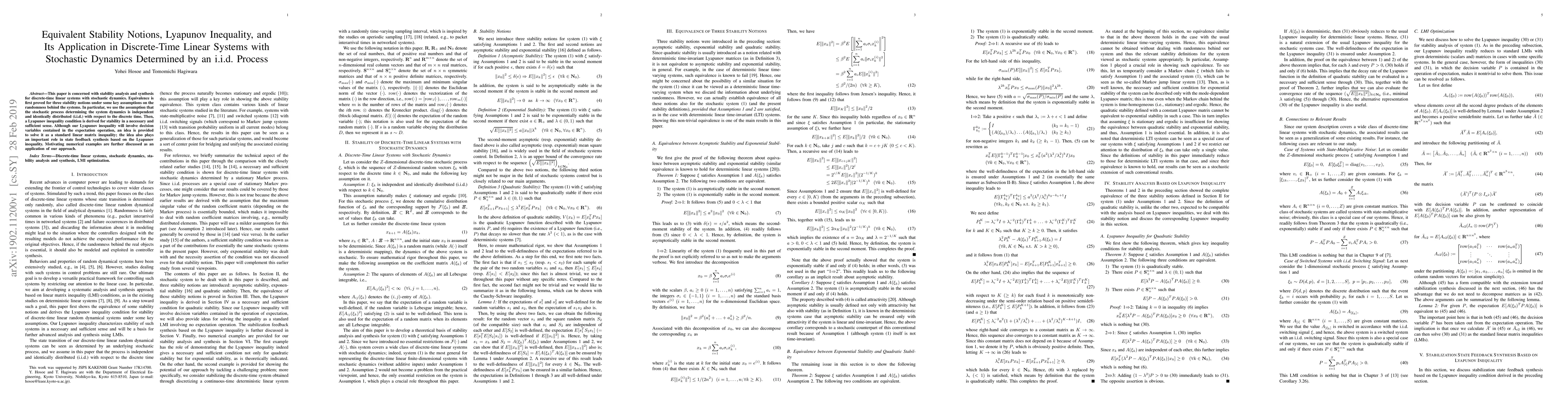 This paper is concerned with stability analysis and synthesis for discrete-time linear systems with stochastic dynamics. Equivalence is first proved for three stability notions under some key assumptions on the randomness behind the systems. In particular, we use the assumption that the stochastic process determining the system dynamics is independent and identically distributed (i.i.d.) with respect to the discrete time. Then, a Lyapunov inequality condition is derived for stability in a necessary and sufficient sense. Although our Lyapunov inequality will involve decision variables contained in the expectation operation, an idea is provided to solve it as a standard linear matrix inequality; the idea also plays an important role in state feedback synthesis based on the Lyapunov inequality. Motivating numerical examples are further discussed as an application of our approach.