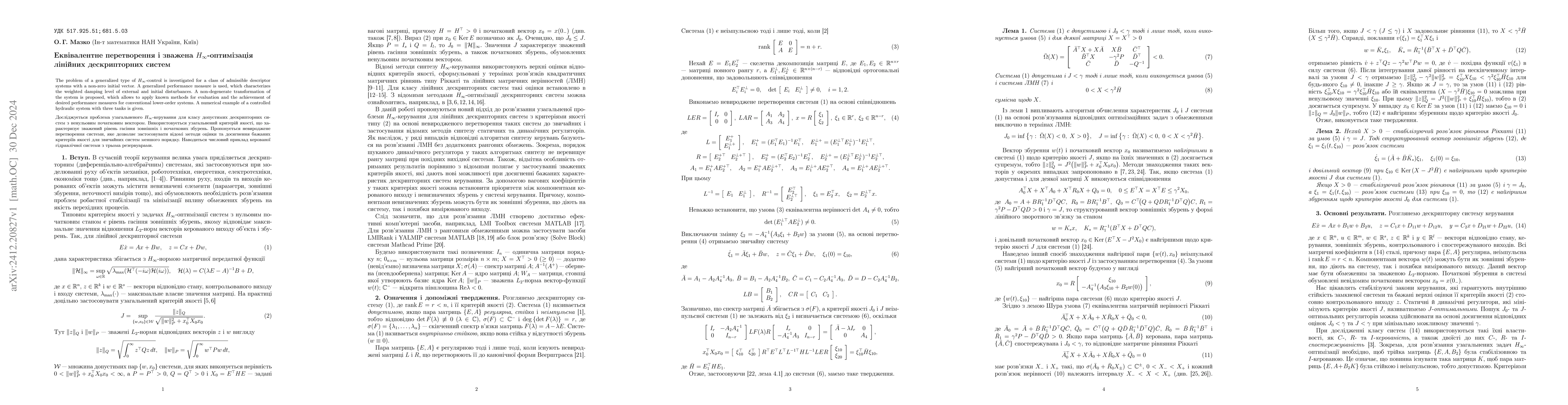 The problem of a generalized type of $H_\infty$-control is investigated for a class of admissible descriptor systems with a non-zero initial vector. A generalized performance measure is used, which characterizes the weighted damping level of external and initial disturbances. A non-degenerate transformation of the system is proposed, which allows to apply known methods for evaluation and the achievement of desired performance measures for conventional lower-order systems. A numerical example of a controlled hydraulic system with three tanks is given.