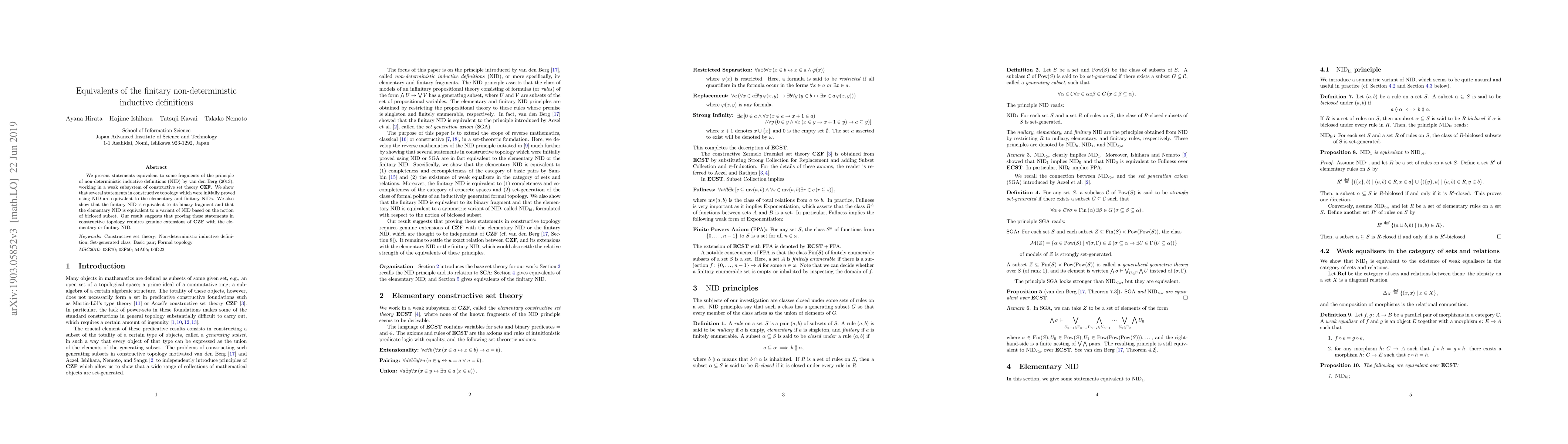 We present statements equivalent to some fragments of the principle of non-deterministic inductive definitions (NID) by van den Berg (2013), working in a weak subsystem of constructive set theory CZF. We show that several statements in constructive topology which were initially proved using NID are equivalent to the elementary and finitary NIDs. We also show that the finitary NID is equivalent to its binary fragment and that the elementary NID is equivalent to a variant of NID based on the notion of biclosed subset. Our result suggests that proving these statements in constructive topology requires genuine extensions of CZF with the elementary or finitary NID.