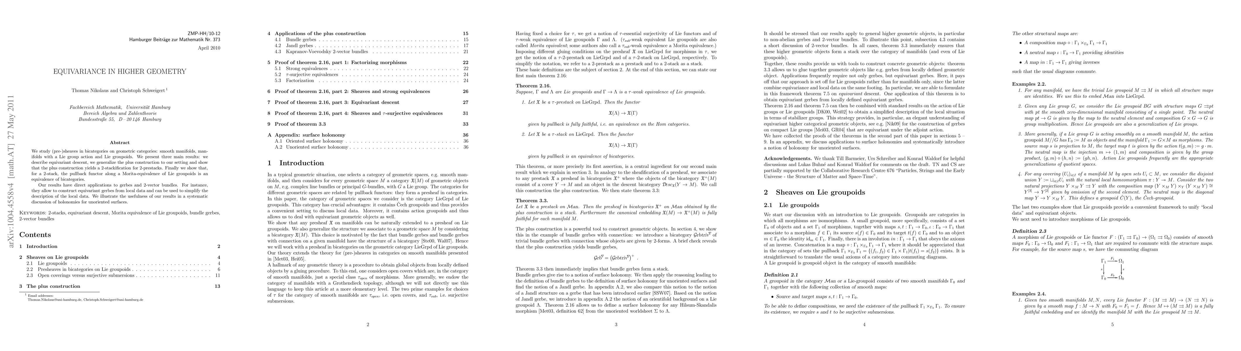 We study (pre-)sheaves in bicategories on geometric categories: smooth manifolds, manifolds with a Lie group action and Lie groupoids. We present three main results: we describe equivariant descent, we generalize the plus construction to our setting and show that the plus construction yields a 2-stackification for 2-prestacks. Finally we show that, for a 2-stack, the pullback functor along a Morita-equivalence of Lie groupoids is an equivalence of bicategories. Our results have direct applications to gerbes and 2-vector bundles. For instance, they allow to construct equivariant gerbes from local data and can be used to simplify the description of the local data. We illustrate the usefulness of our results in a systematic discussion of holonomies for unoriented surfaces.