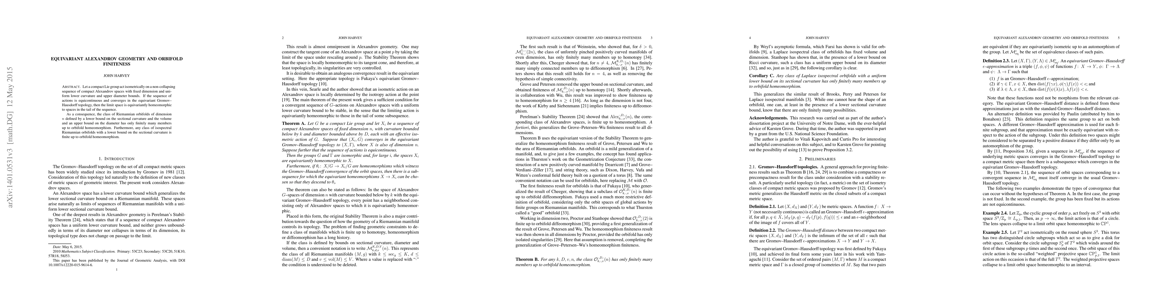 Let a compact Lie group act isometrically on a non-collapsing sequence of compact Alexandrov spaces with fixed dimension and uniform lower curvature and upper diameter bounds. If the sequence of actions is equicontinuous and converges in the equivariant Gromov--Hausdorff topology, then the limit space is equivariantly homeomorphic to spaces in the tail of the sequence. As a consequence, the class of Riemannian orbifolds of dimension $n$ defined by a lower bound on the sectional curvature and the volume and an upper bound on the diameter has only finitely many members up to orbifold homeomorphism. Furthermore, any class of isospectral Riemannian orbifolds with a lower bound on the sectional curvature is finite up to orbifold homeomorphism.